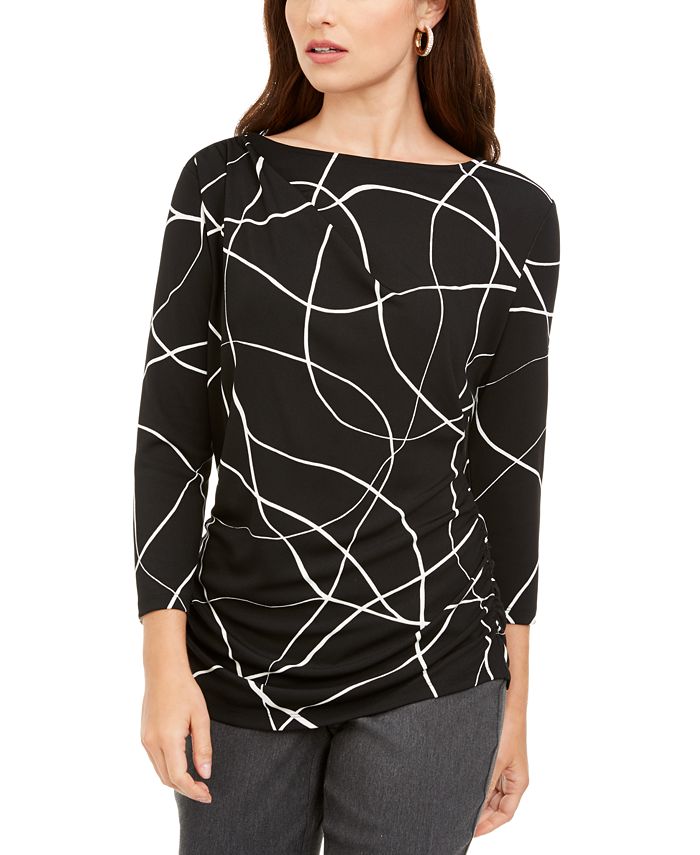 A Alfani traz sofisticação sem esforço para o seu look nesta temporada com este top com decote canoa. Cordões nas laterais criam uma textura franzida que valoriza o corpo. | Comprimento aproximado de 63 cm | Decote canoa | Cordões franzidos nas laterais | Mangas 3/4 |
