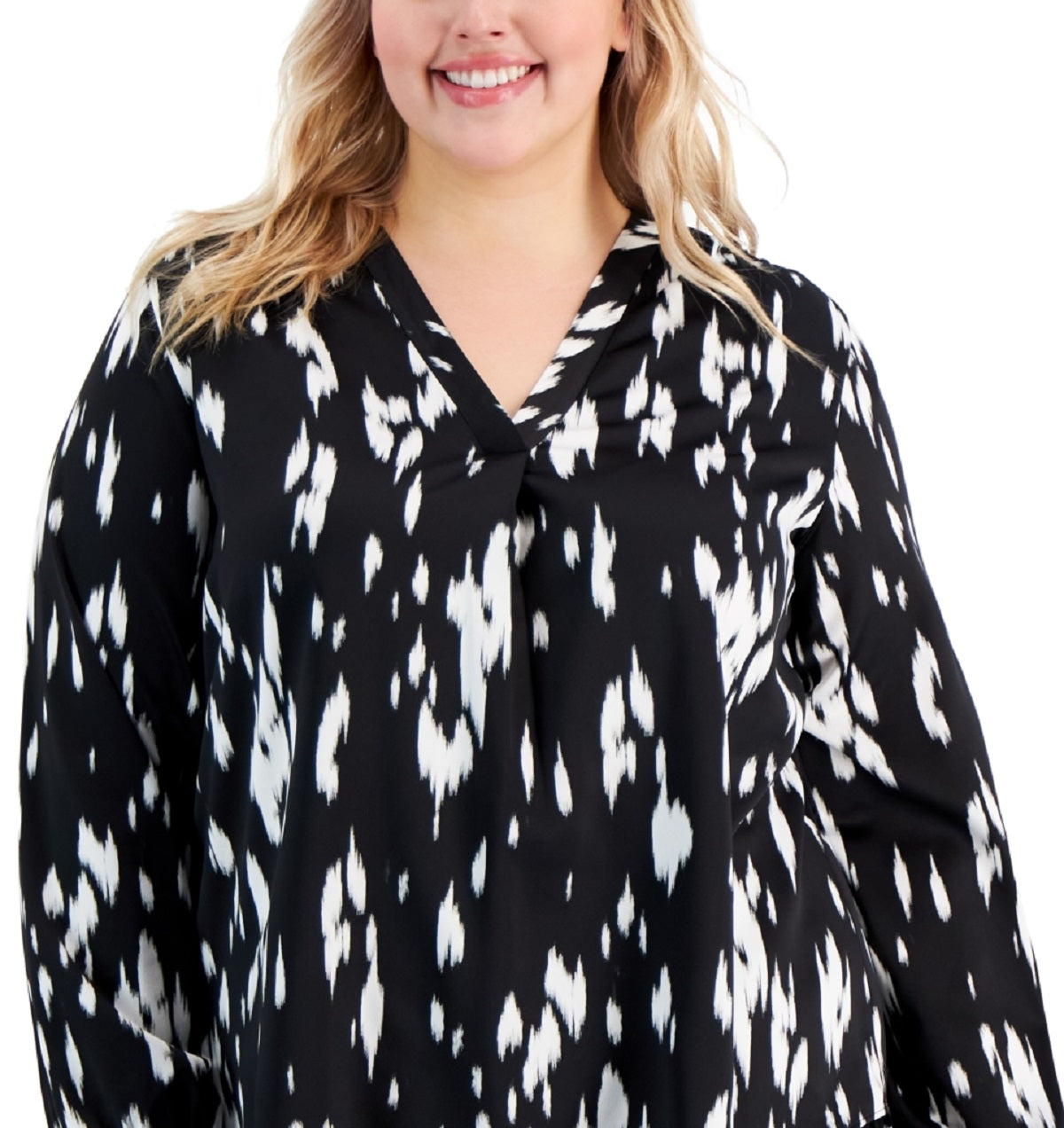 Blusa feminina Alfani com estampa decote em V, cano alto e baixo, preta, tamanho 2X