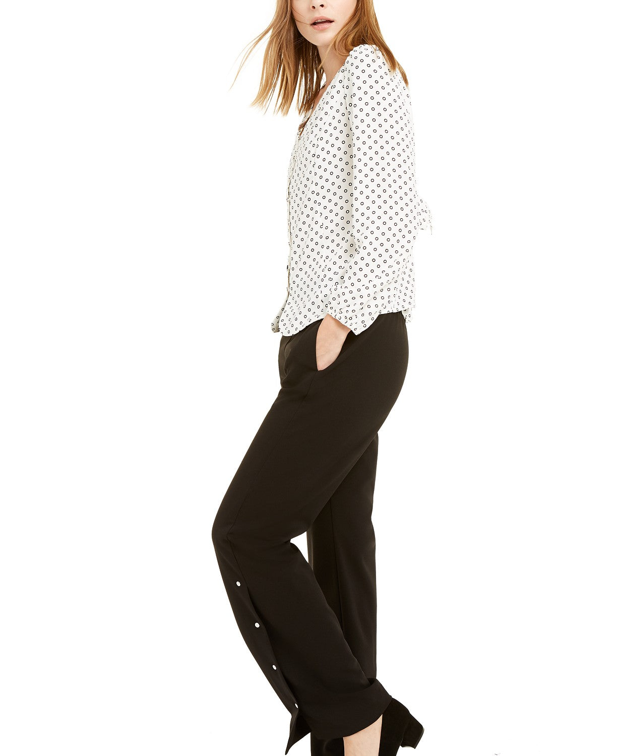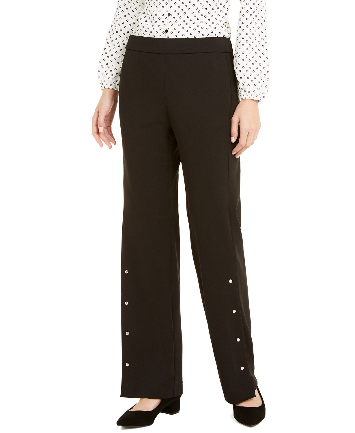 Altura aproximada da modelo: 1,78 m e ela veste tamanho pequeno | Costura interna aproximada: 78 cm | Gancho frontal: aprox. 28 cm; gancho traseiro: aprox. 41 cm; perna larga | Estilo pull-on | Enfeites de rebites na parte inferior da perna | Poliéster/elastano | Lavável à máquina | Importado