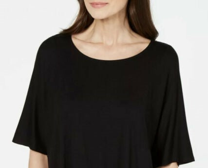 Ajuste nos quadris | Decote redondo | Mangas estilo morcego na altura do cotovelo | Rayon/elastano