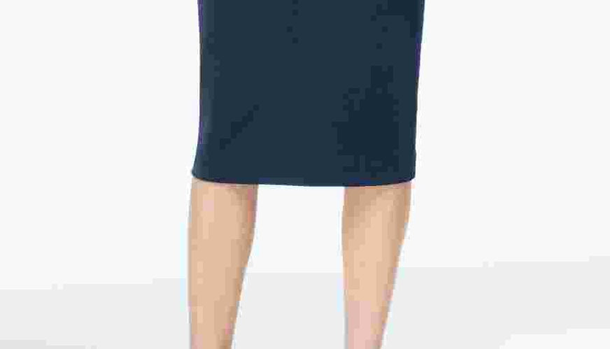 Fecho de zíper exposto nas costas; cós elástico oculto | Silhueta lápis | Sem forro | Fenda na bainha traseira | Abaixo do joelho; aprox. 71 cm de comprimento