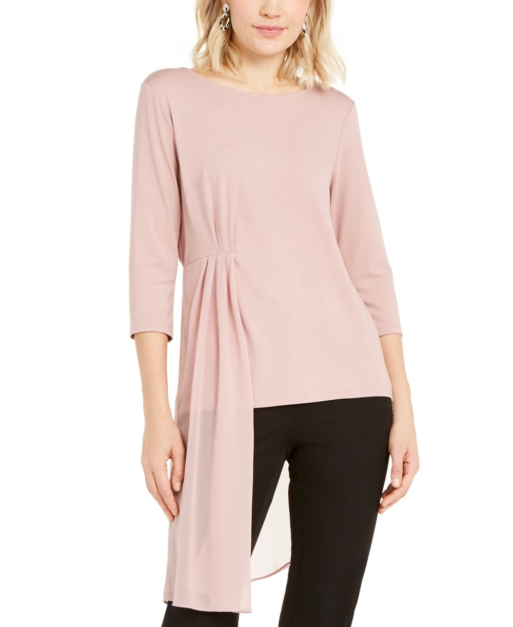 Aproximadamente 24-7/8" de comprimento | Decote redondo | Sobreposição assimétrica transparente à direita | Mangas 3/4