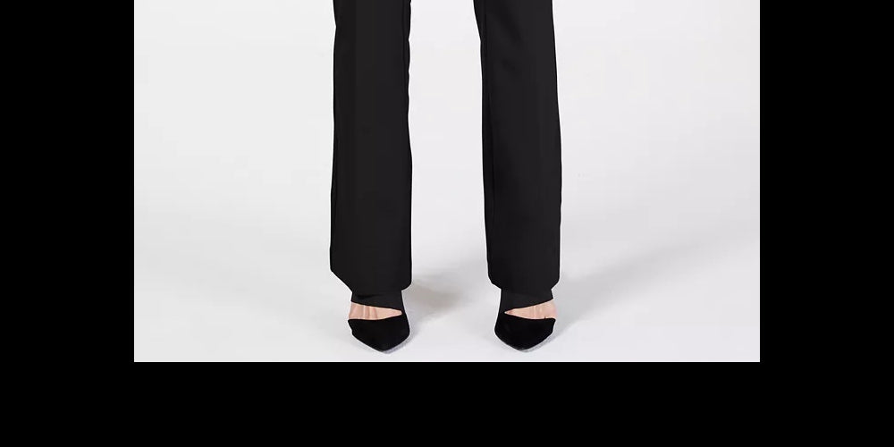 Costura interna aprox.: 30" | Altura frontal: aprox. 8"; Altura traseira: aprox. 14-3/4"; ajuste da calça nos quadris e coxas; perna larga | Projetado para se ajustar e valorizar pessoas de 5'4" ou menos | Zíper com fecho de pressão na frente | Painel de controle da barriga na frente | Bolsos embutidos nas costas