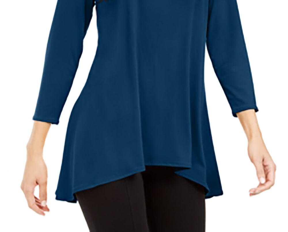 Ajuste no quadril | Projetado para se ajustar e valorizar pessoas de 1,62 m ou menos | Decote redondo | Bainha rodada | Mangas 3/4