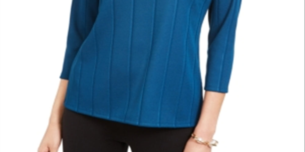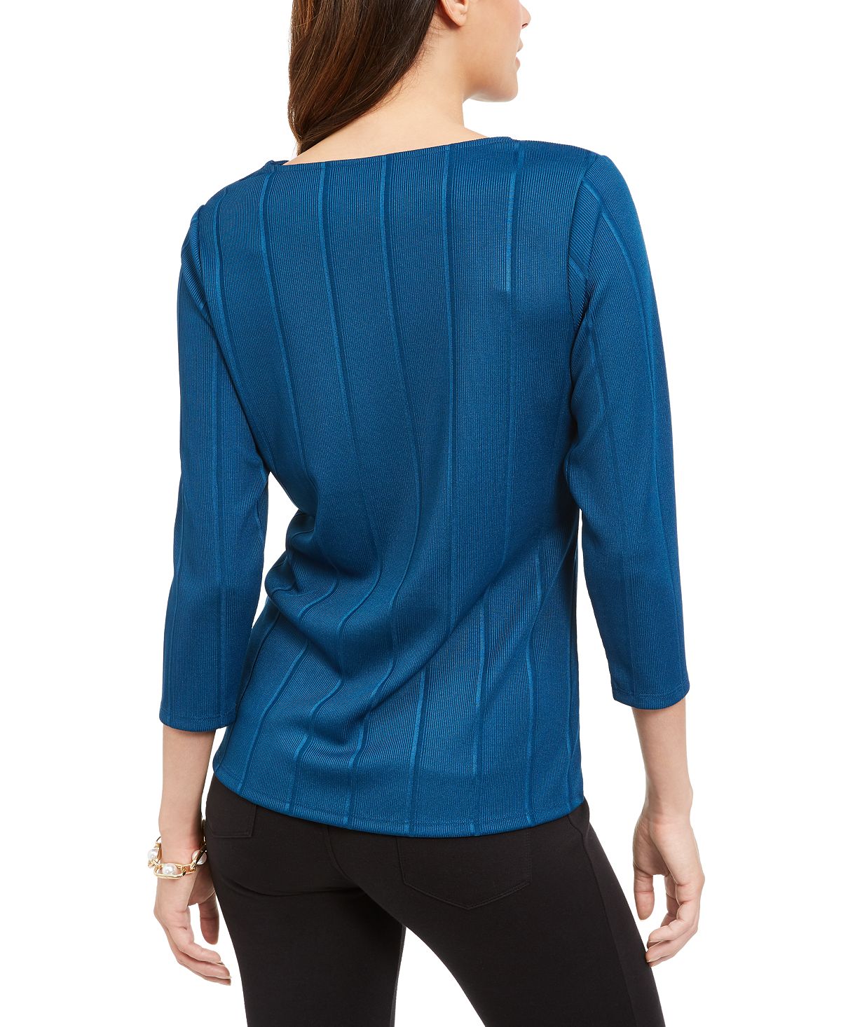 O clássico look de escritório com um toque especial! O top liso e pequeno da Alfani apresenta um detalhe de torção no decote para dar um estilo instantâneo ao seu look. | Projetado para se ajustar e valorizar pessoas de 1,62 m ou menos | Comprimento aproximado de 60 cm; atinge os quadris | Decote em V com detalhe de torção no decote; estilo pulôver | Mangas três quartos | Poliéster/elastano
