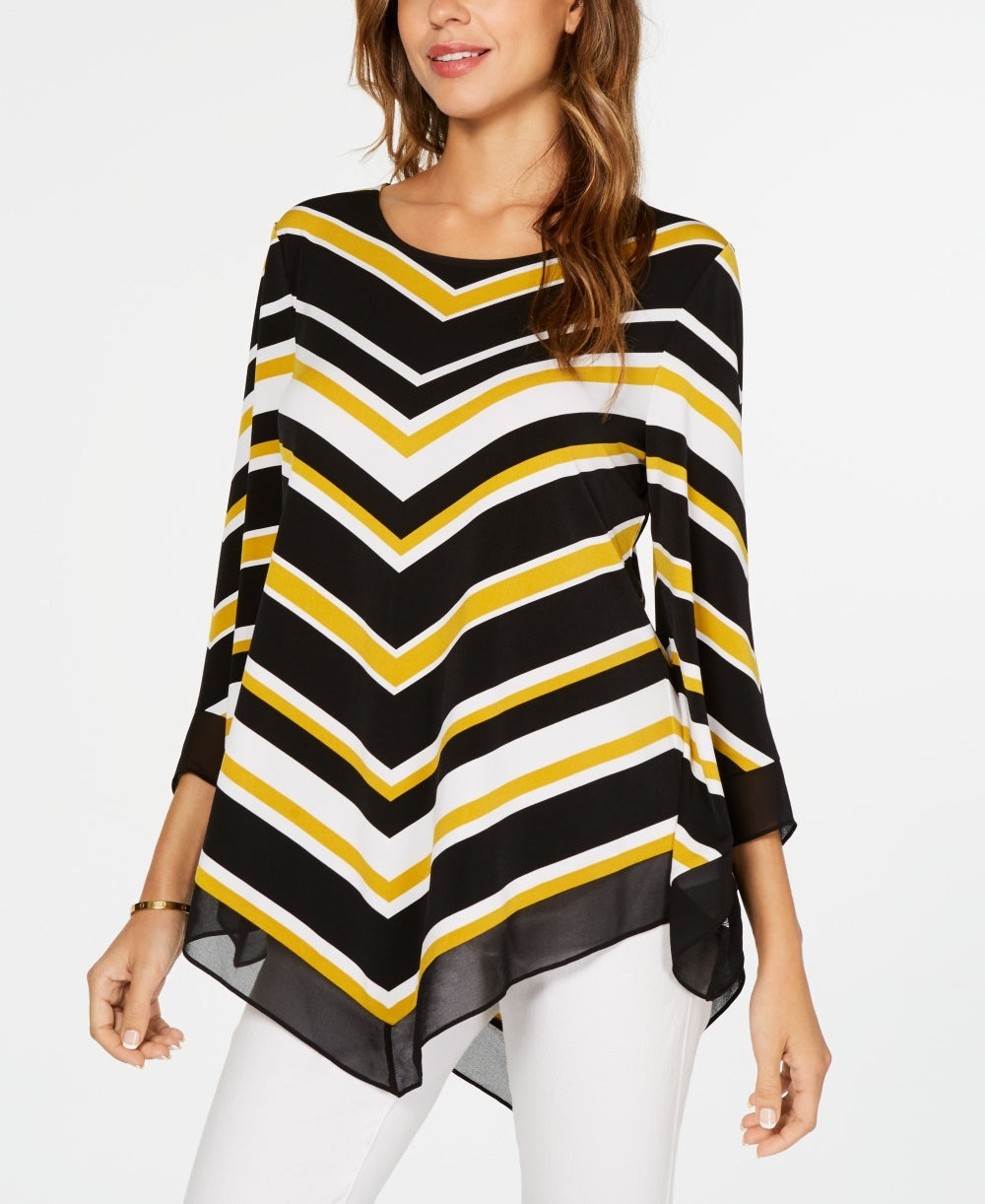 Comprimento aproximado do quadril; aprox. 27-3/8 | Projetado para se ajustar e valorizar pessoas de 1,62 m ou menos | Decote redondo | Bainha em V | Mangas 3/4