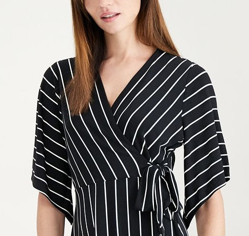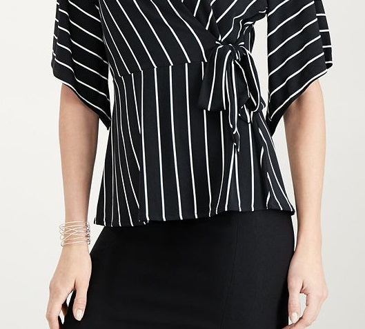 Adicione um toque de ousadia ao seu visual com este top Alfani pequeno com sobreposição falsa que reúne listras e bainhas angulares, incluindo um decote sobrepeliz e punhos assimétricos, para uma sensação elegante e estilosa. Ajuste no quadril, projetado para se ajustar e valorizar pessoas de 1,62 m ou menos, decote sobrepeliz; silhueta com sobreposição falsa, detalhe de amarração na cintura.