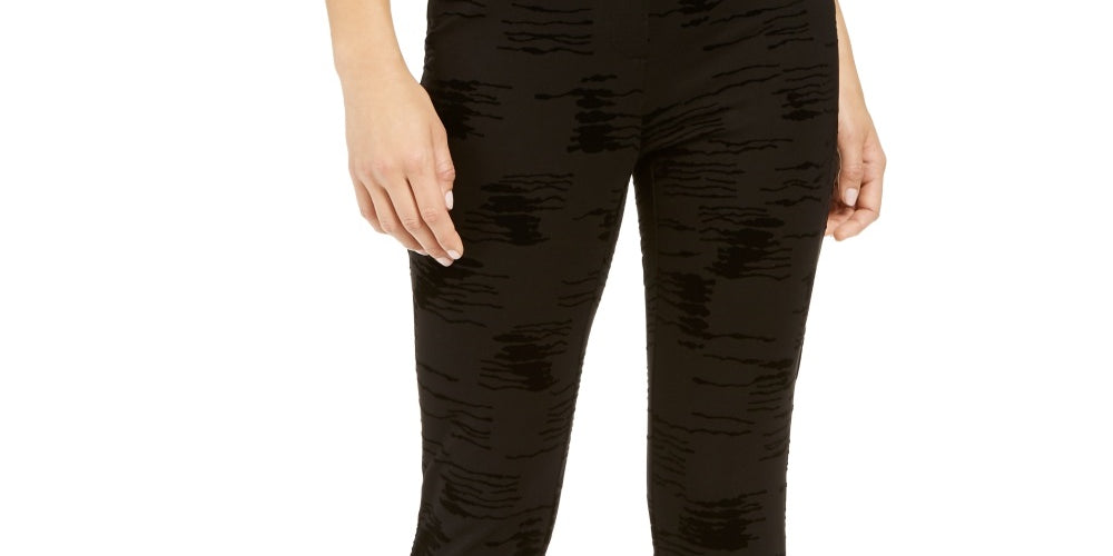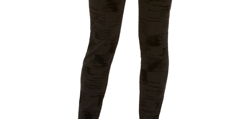 Costura interna aprox.: 29-1/2" | Altura frontal: aprox. 9-1/4"; Altura traseira: aprox. 16-1/8"; perna skinny | Fecho de zíper frontal | Estampa flocada de veludo por toda parte | 2 bolsos traseiros falsos de debrum