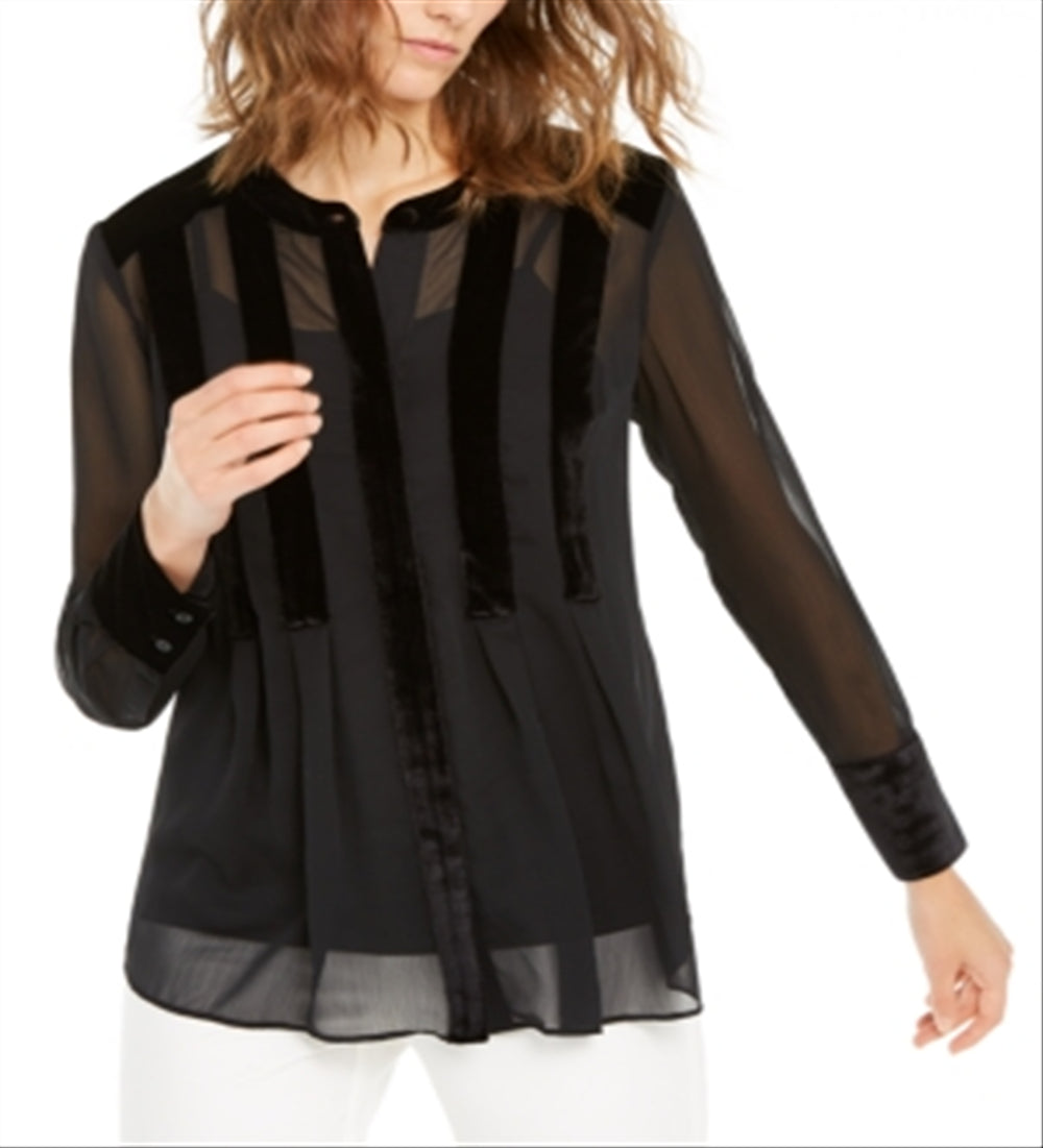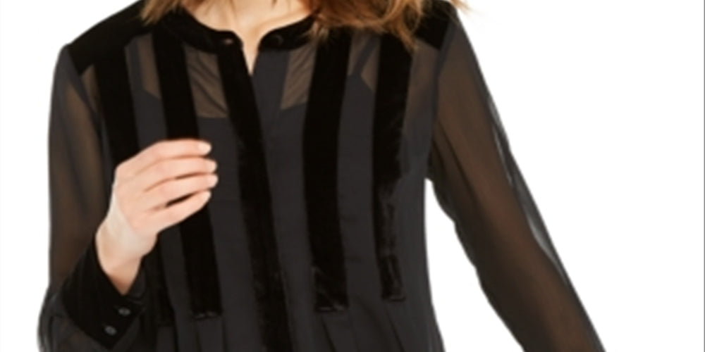 Blusa feminina Alfani com botões frontais e acabamento em veludo, preta, tamanho M