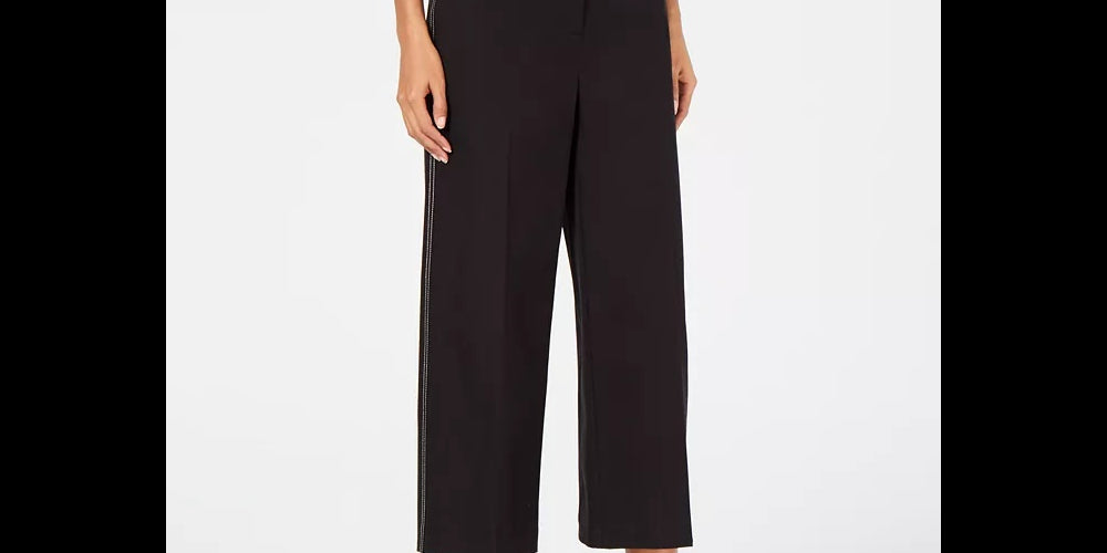 Costura interna aprox.: 23" | Altura frontal aprox. 11"; Altura traseira aprox. 17-3/4"; perna larga chega na metade da panturrilha | Projetado para se ajustar e valorizar pessoas de 1,62 m ou menos | Fecho de zíper e botão na frente; passadores de cinto | Costura contrastante no cinto e na lateral da perna | Bolsos falsos embutidos nas costas