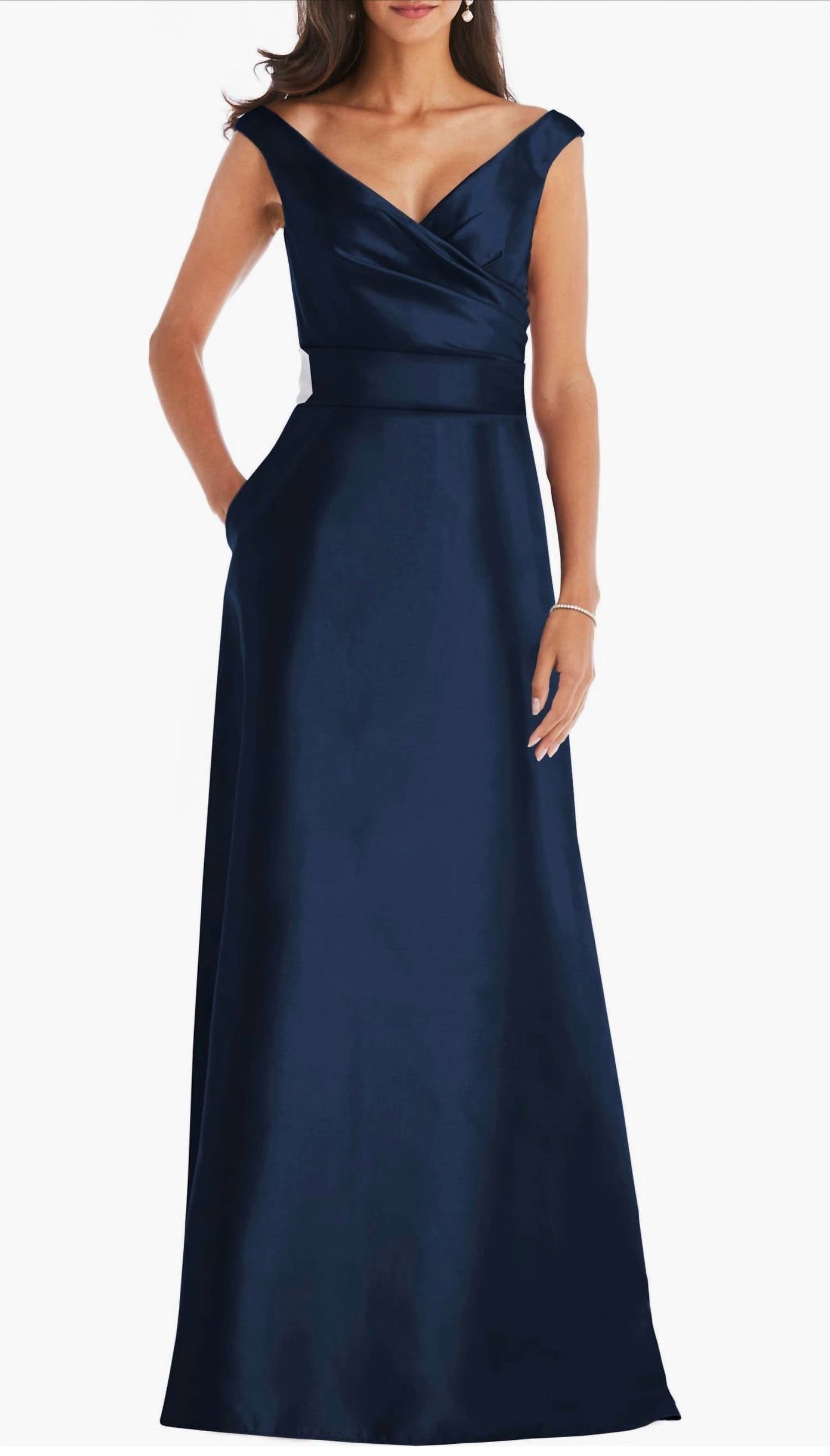 Designed for the bride who values understated elegance. Its classic design and perfect fit make it the ideal choice for your special day. Say yes to the dress! Step into sophistication with the ALFRED SUNG Off The Shoulder Satin Gown, a must-have for fall weddings. This stunning sleeveless gown, featuring an off-the-shoulder V-neckline, is crafted from 100% polyester in a rich midnight blue. With its elegant A-line silhouette, it features a hidden back zip closure and practical side-seam pockets, making it both stylish and functional. Care for this quiet luxury piece by opting for dry cleaning or a gentle machine wash followed by line drying.