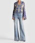 Introducing the Willa Bell Sleeve Top by Alice + Olivia, a sophisticated piece in the enchanting Forevermore pattern. This women's top features long bell sleeves and a stylish collared neckline, offering a modern twist on the classic button-down with a hidden placket. Crafted from 100% viscose, its digitally engineered print makes it a standout selection for spring events like Easter or a chic dinner party. Closure: Button closure. Care: Dry clean only.