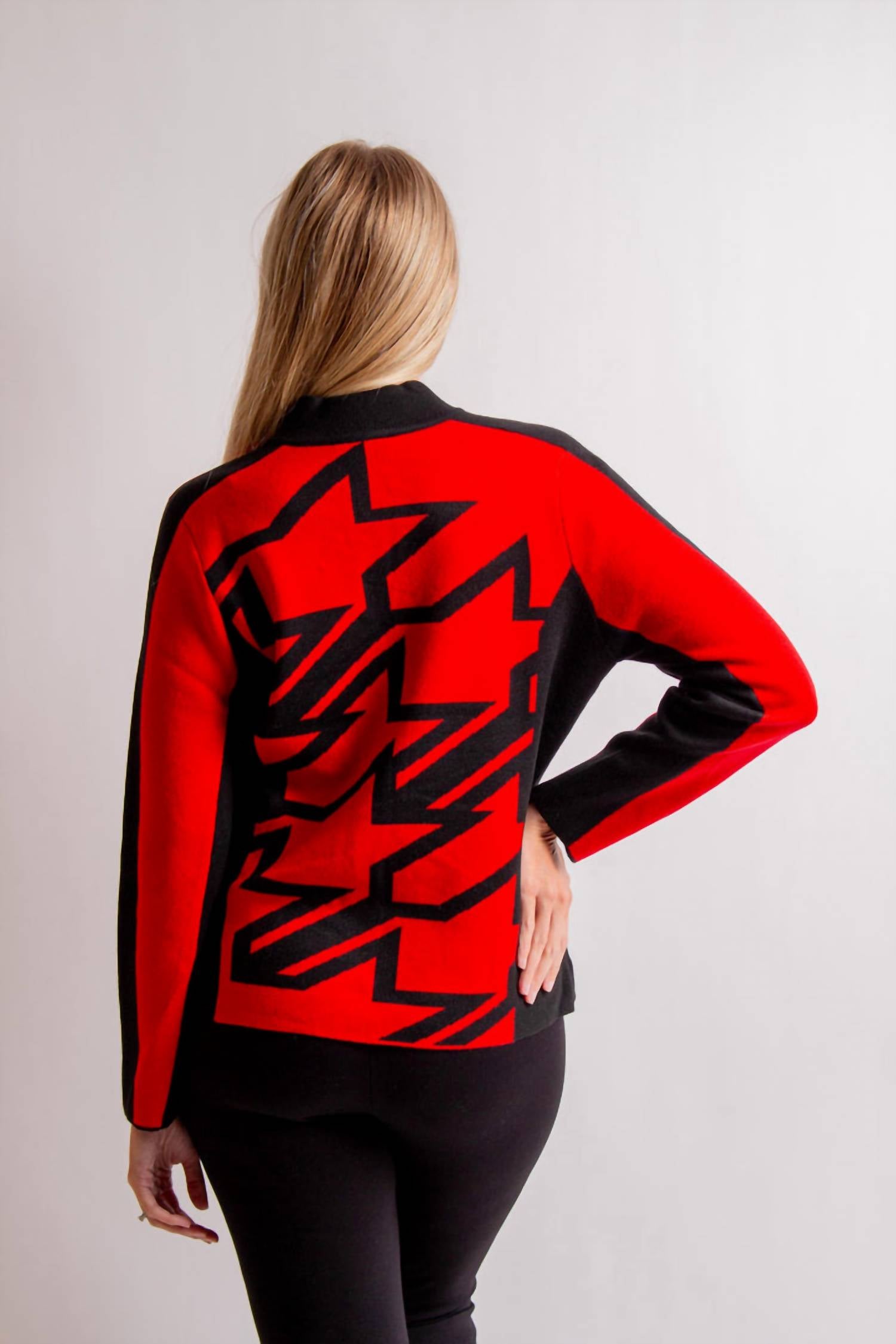 A classic fit that works just as good buttoned as it does left open. Introducing the ALISON SHERI Star Pattern Knitted Jacket, a striking piece perfect for fall gatherings or Christmas celebrations. Crafted from a blend of 55% polyester, 20% acrylic, 20% nylon, and 5% wool, this cardigan features long sleeves and a bold red color with a black star design. It hits at a waist-length for a modern fit and closes with a front button for easy styling. Designed for hand wash care, this cardigan embodies the quiet luxury trend with its elegant V-neck and intricate pattern, making it an ideal choice for a dinner party.