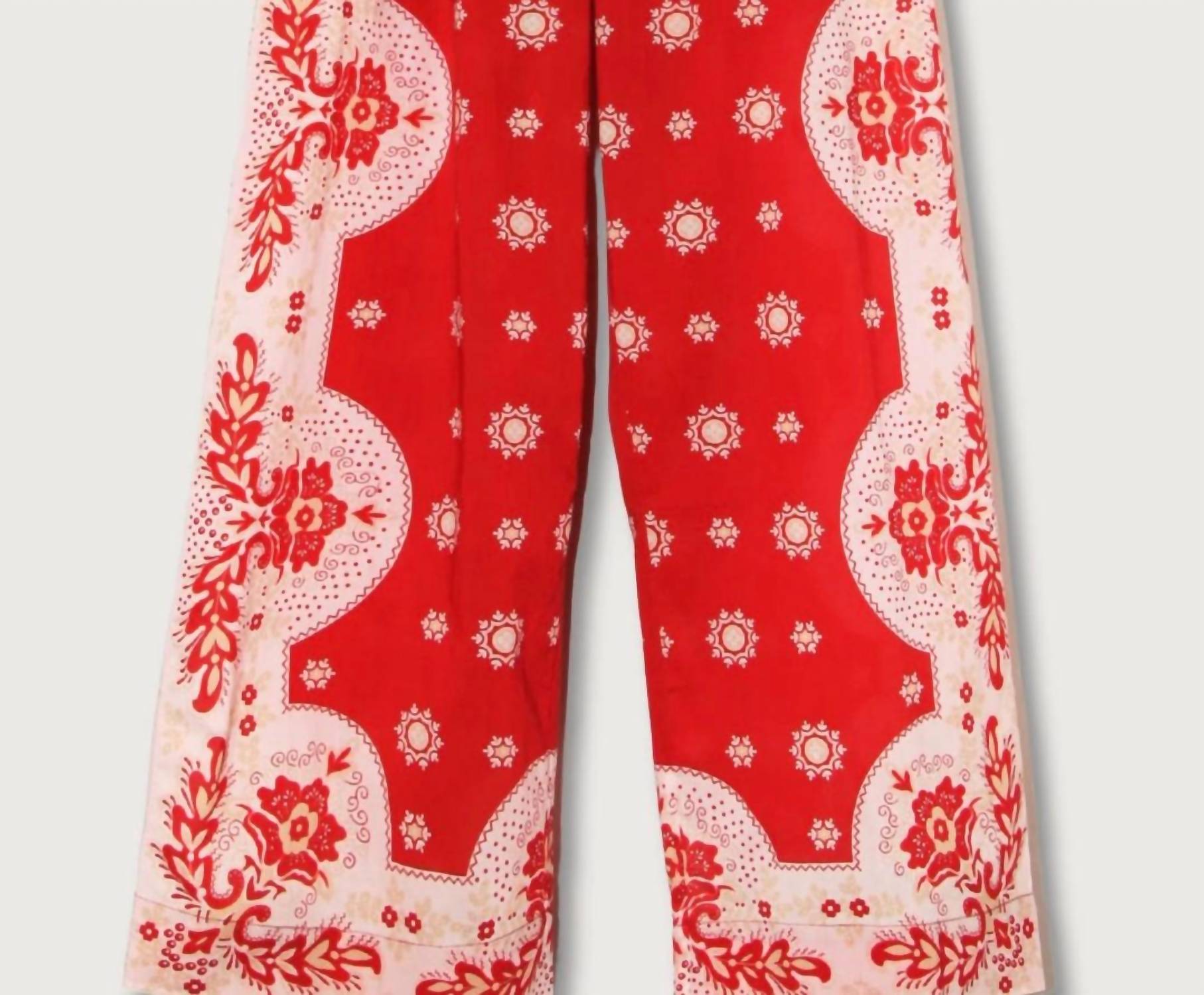 Introducing the Otto Lava Bandana Short Pant by ALIX OF BOHEMIA, a vibrant addition to your summer wardrobe in bold red. These high-waisted, cropped pants feature a wide-leg and relaxed fit. They are pull-on style with side pockets and an elastic waistband for comfort. Crafted from 100% cotton and made from imported materials, these pants are ideal for a beach day. Care instructions recommend dry cleaning.