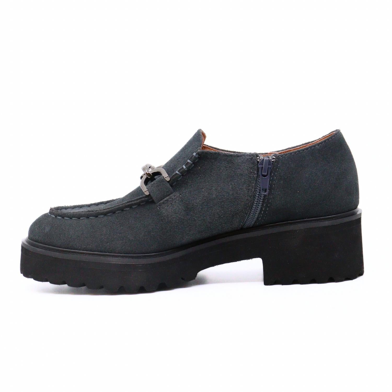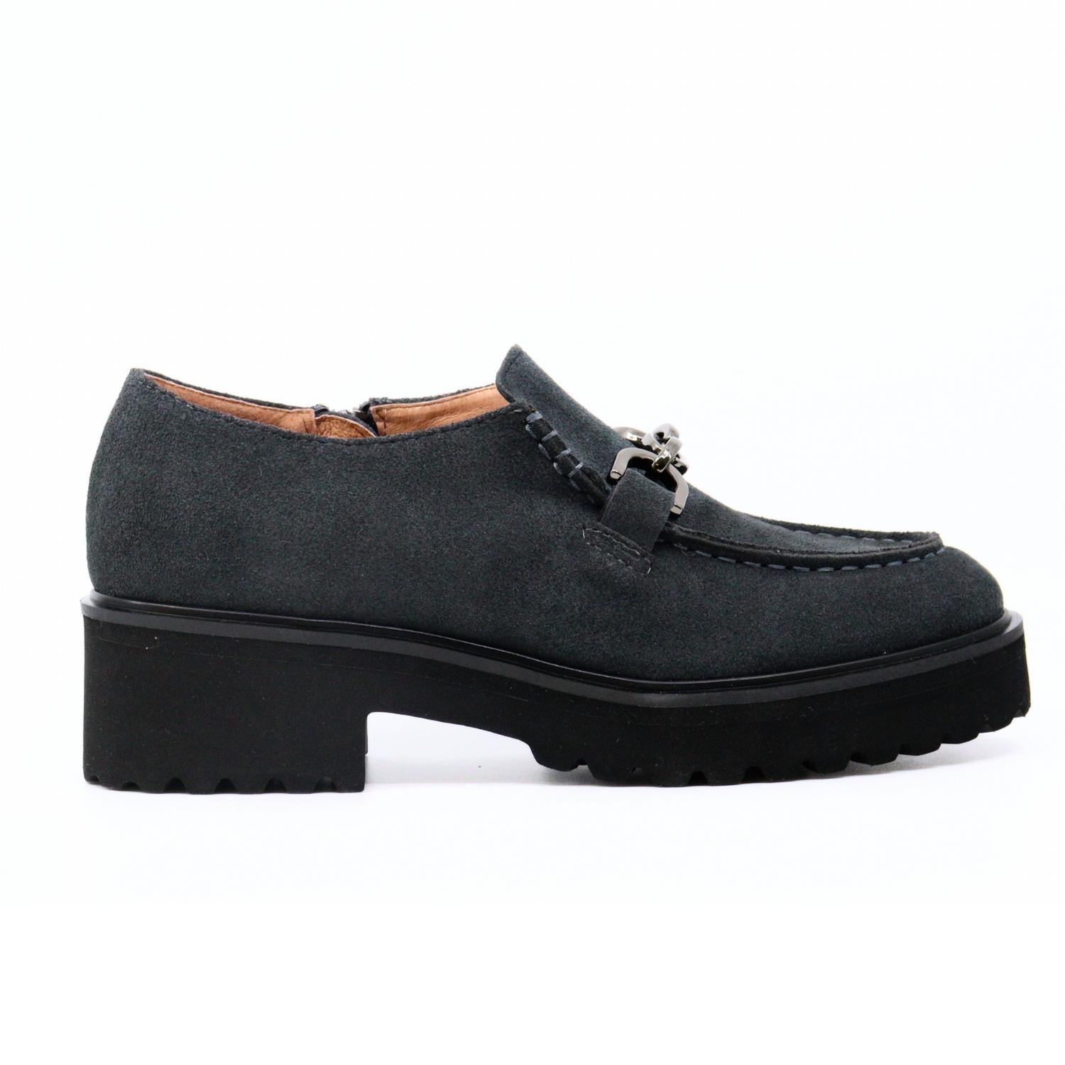 Step effortlessly into modern style with the Women's Link Loafer by ALL BLACK, crafted to blend sophistication with an edgy flair. Composed of rich dark grey suede and adorned with a metal chain link, these loafers offer a pointed toe for a chic finish. The chunky synthetic sole delivers a 2" heel on a 1" platform, providing a subtle lift, while the inside zipper ensures easy wearability. Ideal for elevating your spring wardrobe, these loafers pair perfectly with both casual and formal outfits.