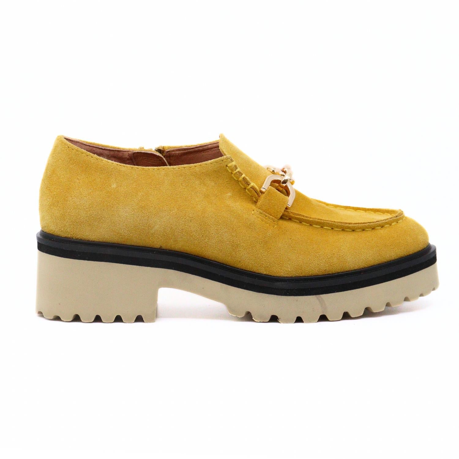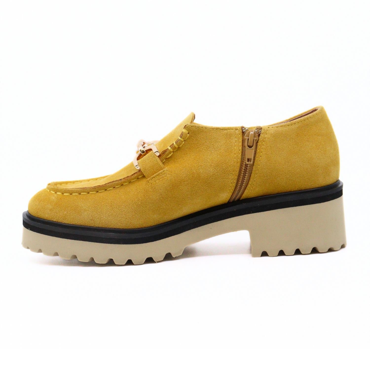 Step into style with the Women's Link Loafer by ALL BLACK, a stunning addition to your spring wardrobe. Made with a captivating golden leather upper, this loafer is perfect for adding sophistication to any outfit. The shoe features a chunky, lightweight synthetic sole and a platform heel for a 2" boost. It includes an inside zipper for easy wear and boasts a 1" platform, making it a standout choice for both comfort and trendsetting flair.
