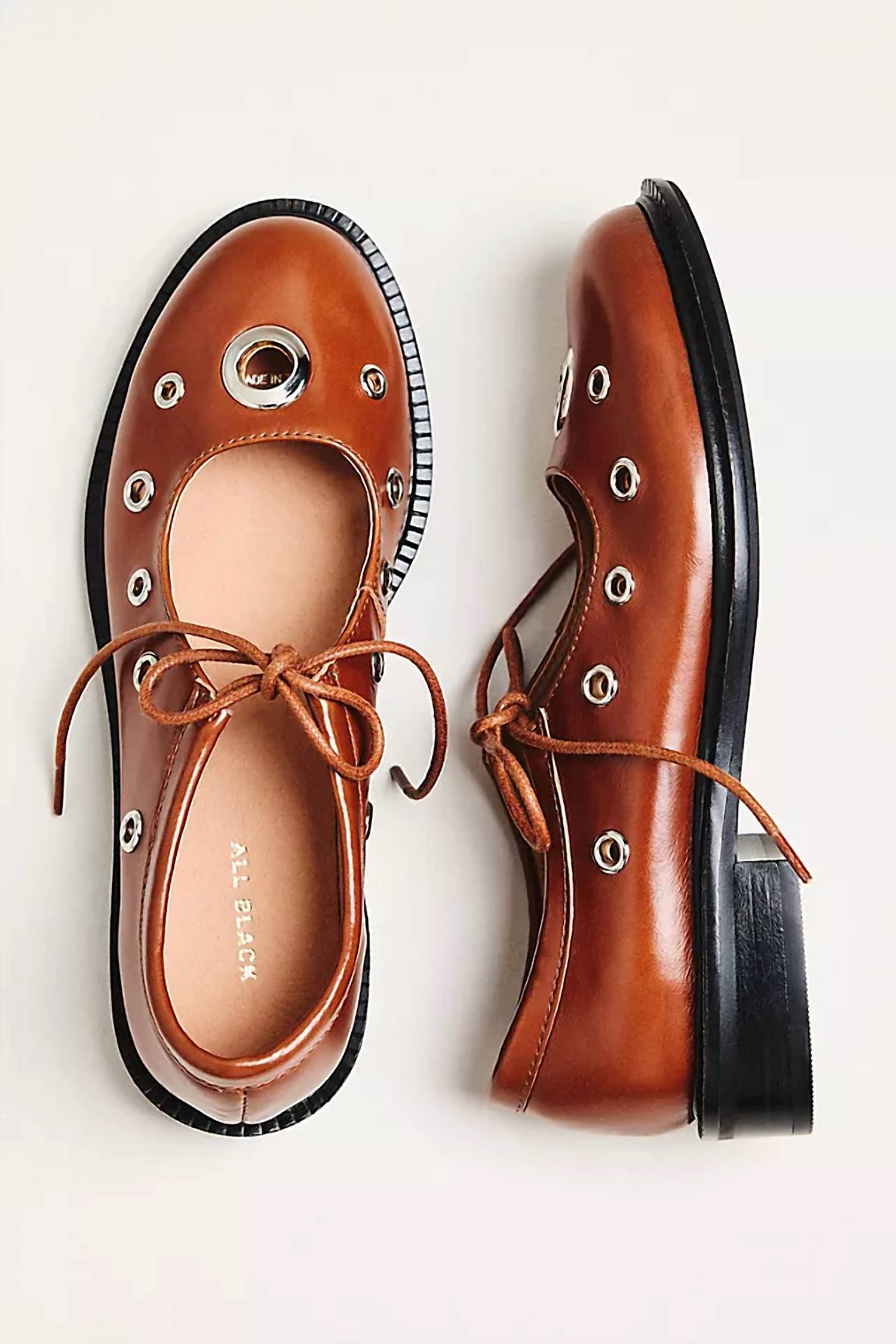 Meet the Ms. Reinforcer Loafer by ALL BLACK, where classic oxford style meets cutting-edge design for a truly standout shoe. Crafted from smooth chestnut leather, this loafer boasts bold silver grommets with a delicate lace-up front for a unique blend of polished and punk aesthetics. A round toe design coupled with a low, stacked block heel ensures all-day comfort and style versatility, making it an ideal choice for fall engagements and seasonal festivities. Perfect for those embracing a '90s fashion revival, this loafer is a sophisticated yet playful addition to any footwear collection.