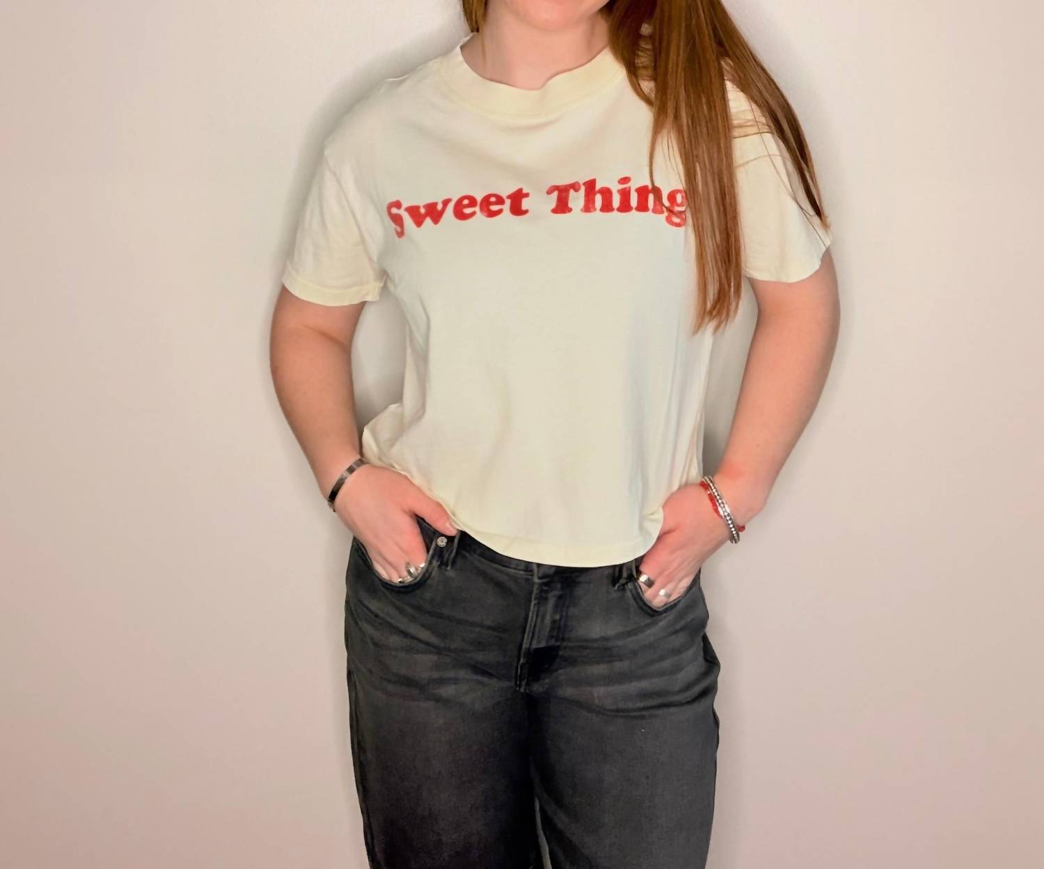 Elevate your streetwear collection with the Sweet Thing Crop Top by All of Us, tailored in a charming butter hue. Designed with short sleeves and a classic crewneck, this graphic tee is perfect for summer versatility. Made for women who love effortless style, this wide crop top is a pull-on piece.