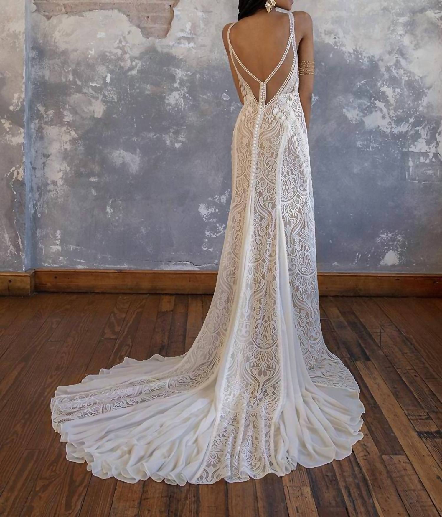 Unveil timeless elegance with the Modern Boho Matte Lace Column Wedding Dress by All Who Wander, crafted in shades of ivory for the modern bride. This sleeveless gown features a bohemian-inspired silhouette with a soft V-neckline and illusion sheer back panels adorned with graphic lace detail. Captivating 3D tassels frame the sheer side cutouts, while the column silhouette gracefully hugs the hips, flowing into an ethereal long cotton chiffon train. The dress's button closure underscores its minimalist charm, with care instructions recommending dry cleaning to maintain its exquisite detail.