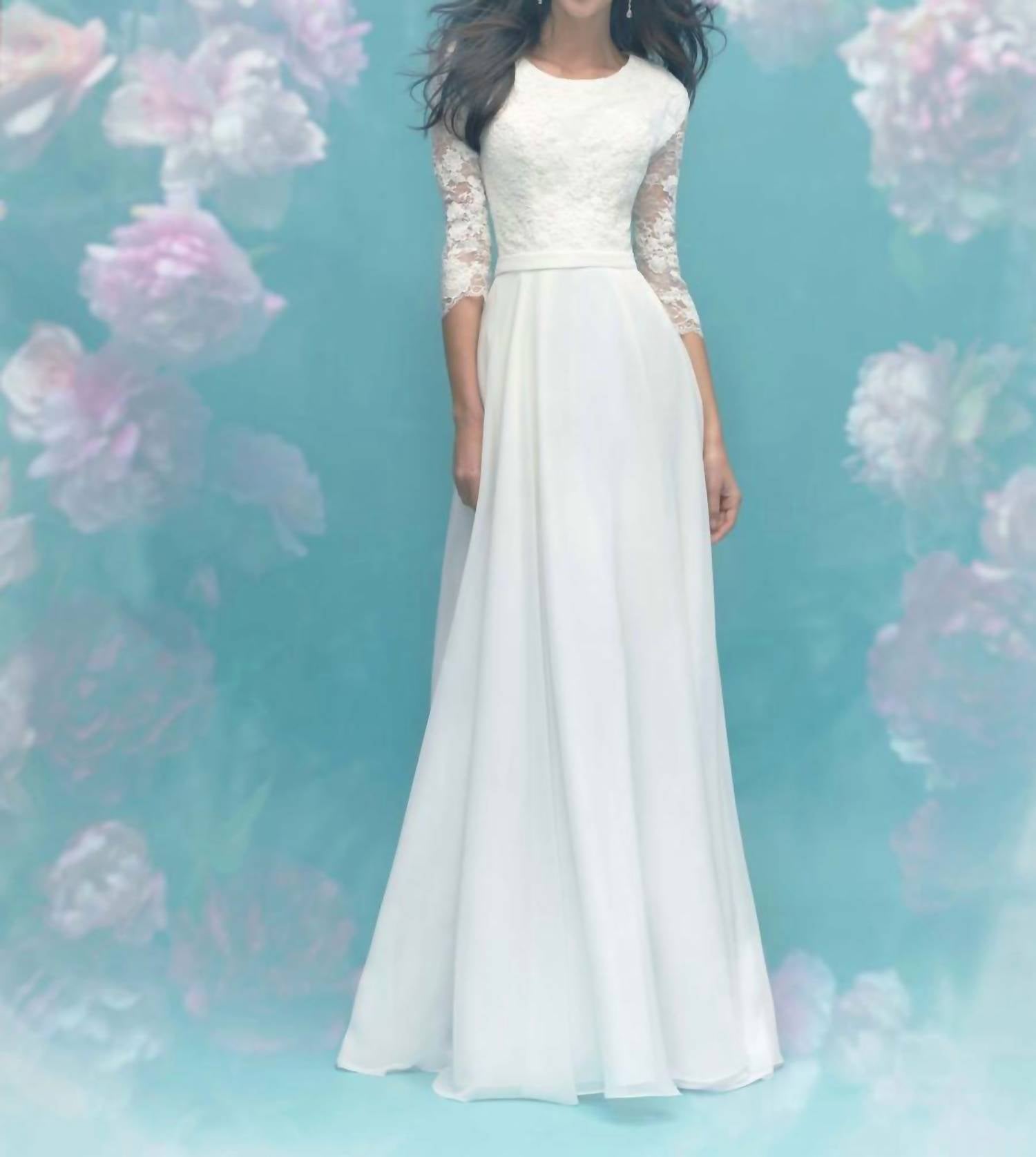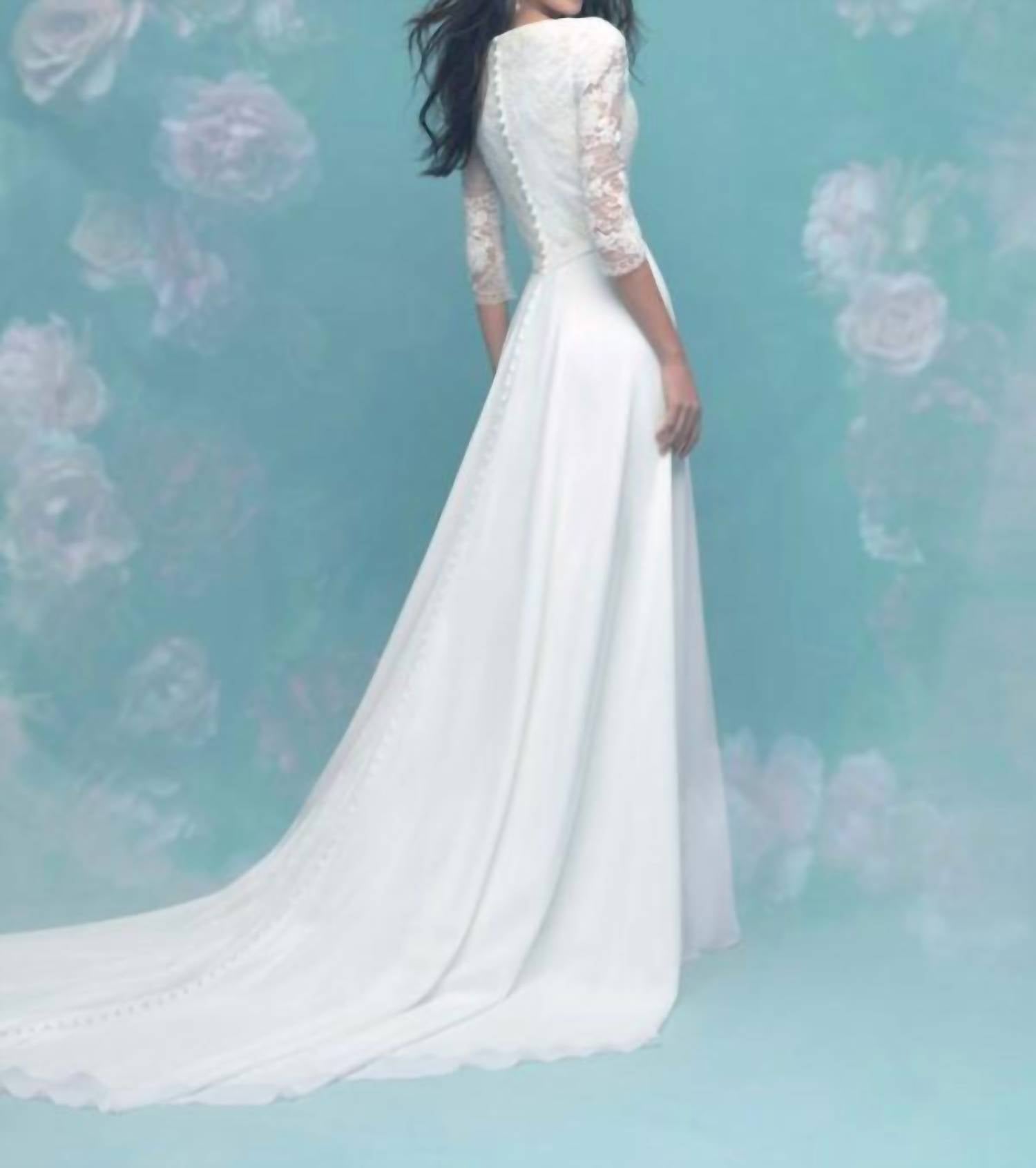 Introducing the Misha A-line Dress by Allure Bridals, an elegant gown in timeless ivory. Featuring three-quarter sleeves crafted from intricate lace, the dress showcases a beautifully textured floral pattern throughout. This maxi-length dress has a delicate chiffon skirt and a dignified swooping neckline, with a satin belt distinguishing the bodice from the gracefully flowing skirt. The full back design is elegantly adorned with cascading faux buttons that conceal a functional zip closure. Perfect for a modest spring wedding, this gown is a testament to quiet luxury.