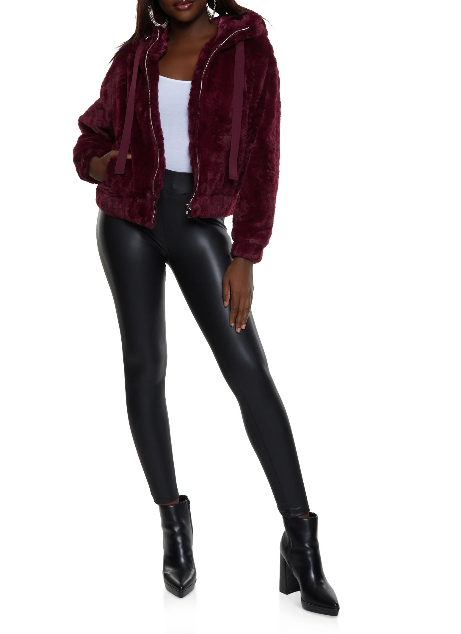 Jaqueta feminina de pele sintética com zíper, tamanho médio, quase famosa, vinho