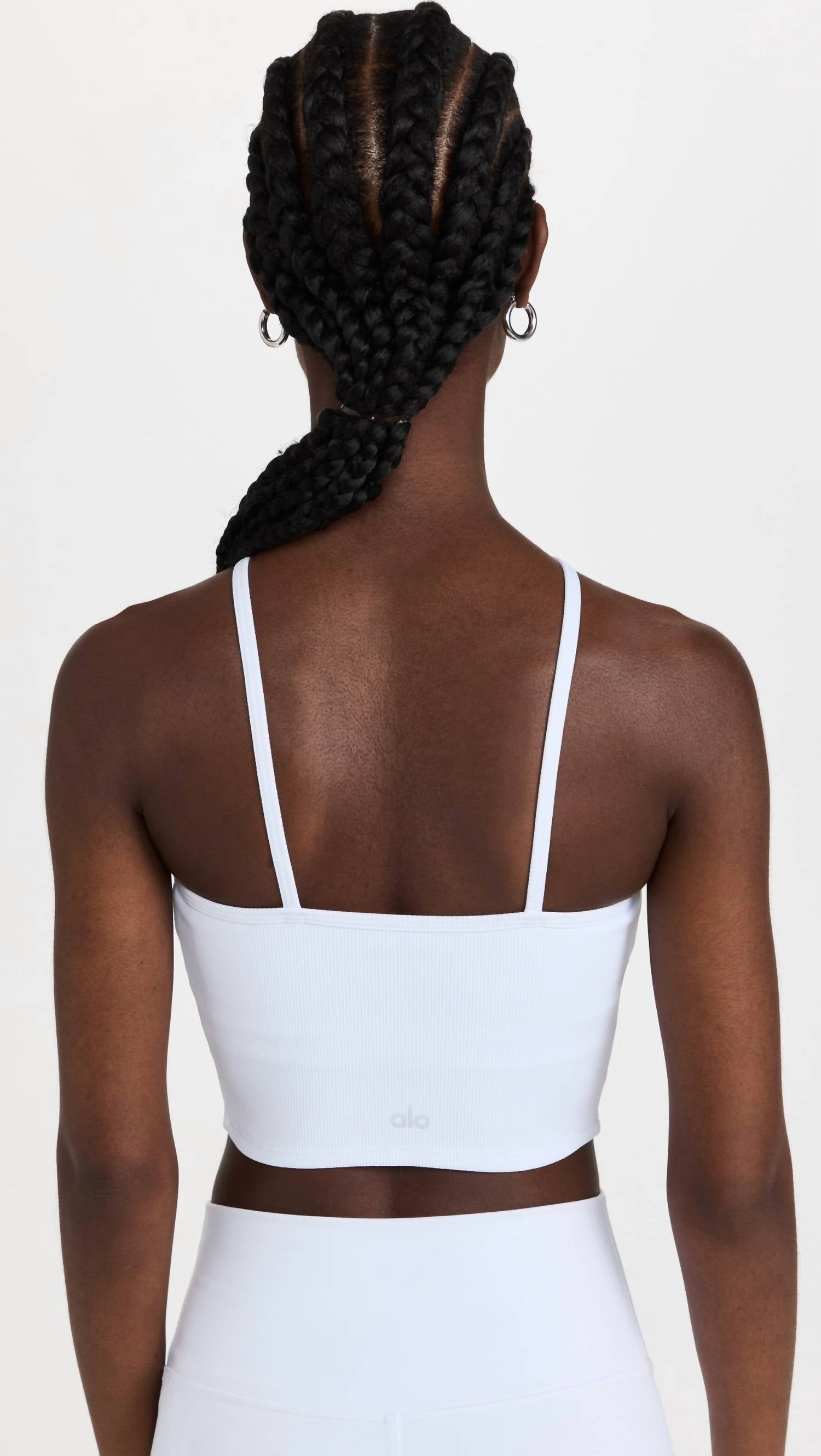 Discover the ALO YOGA Goddess Ribbed Cross Crop Top in timeless white, a sleek and solid addition to your activewear collection. This sleeveless, halter-neck crop top offers light-to-medium support with a built-in shelf bra, perfect for yoga and walking. Crafted from a lightweight ribbed activewear jersey, it's composed of 90% nylon and 10% spandex, with a lining of 92% polyester and 8% spandex. Made in Vietnam, this pull-on style boasts a cropped profile measuring 15.75 inches in length. Care instructions include machine wash cold and tumble dry.