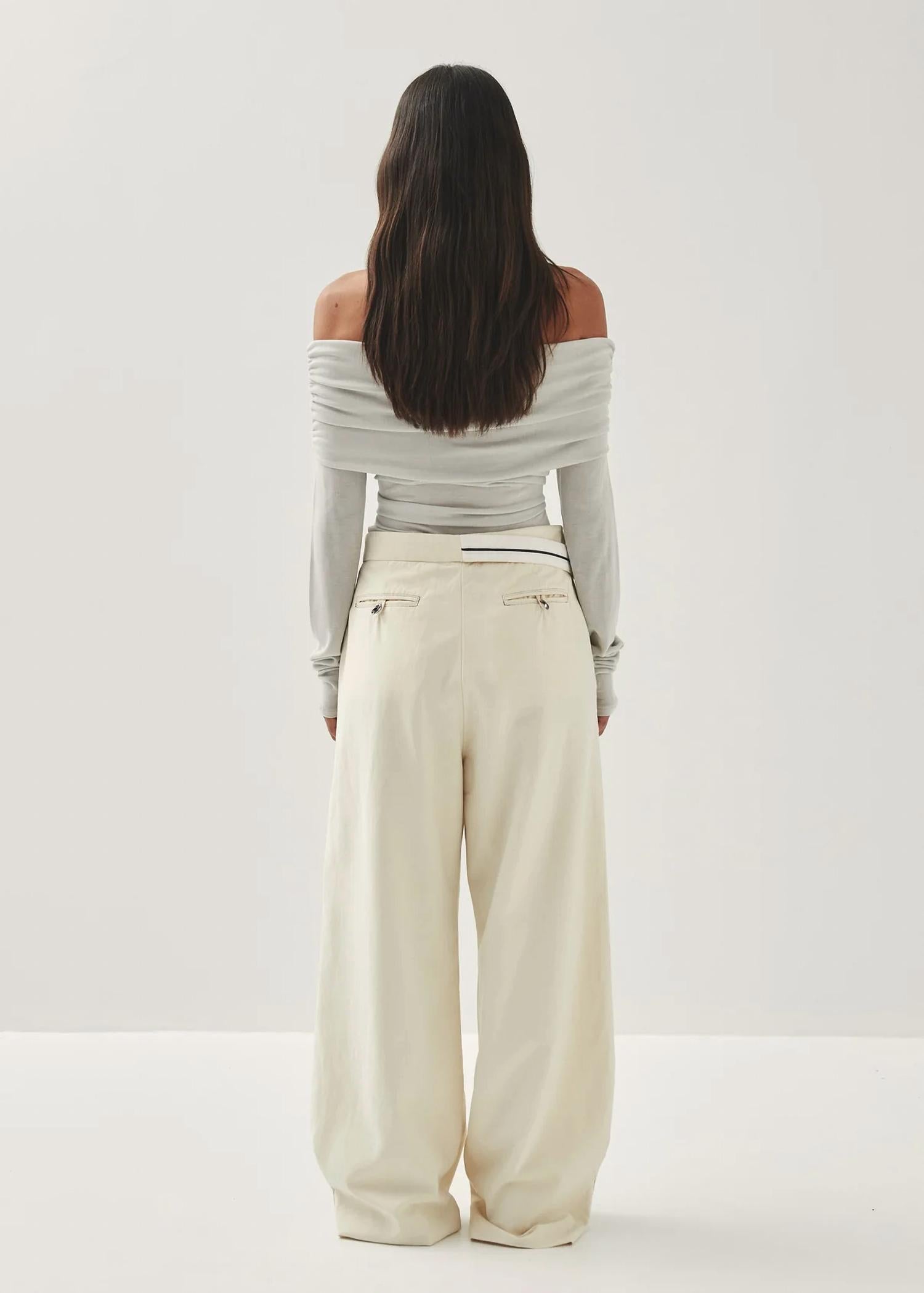The perfect long sleeve tee that goes with just about anything. Introducing the ALOHAS Emica Top, a chic addition to your wardrobe designed for a sophisticated look. This grey top features long sleeves and an elegant off-the-shoulder neckline with a double layer draping over the chest. The solid pattern and side ruching enhance the fitted silhouette, making it ideal for a dinner party. Crafted as a pull-on piece, it's recommended to hand wash for care.