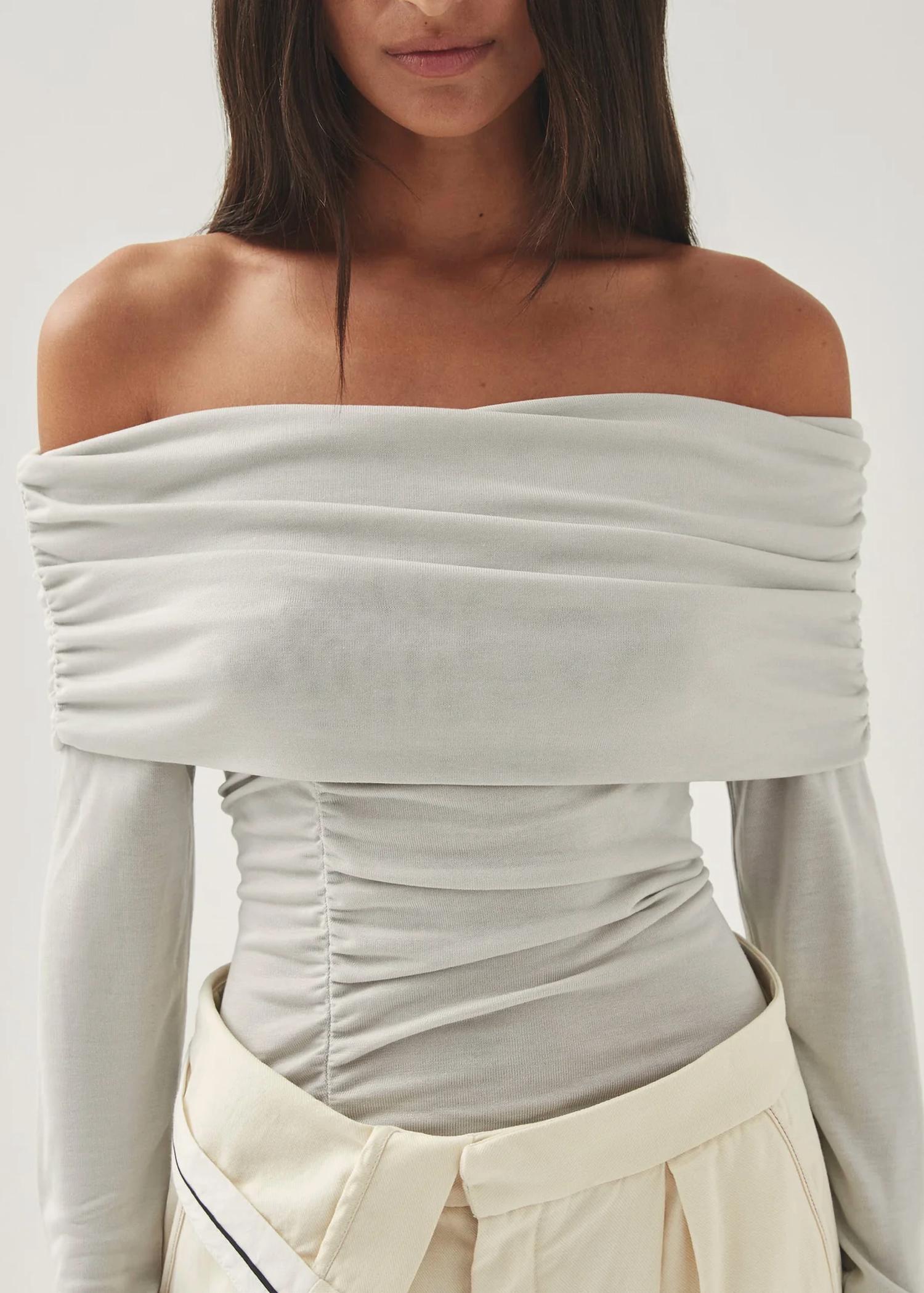 Introducing the ALOHAS Emica Top, a chic addition to your wardrobe designed for a sophisticated look. This grey top features long sleeves and an elegant off-the-shoulder neckline with a double layer draping over the chest. The solid pattern and side ruching enhance the fitted silhouette, making it ideal for a dinner party. Crafted as a pull-on piece, it's recommended to hand wash for care.