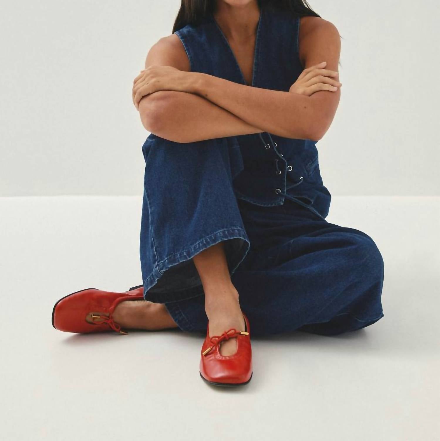Step into elegance with the Women's Rosalind Leather Ballet Flats by ALOHAS, meticulously crafted from sustainable red leather for a timeless minimalist look. These flats feature unlined uppers threaded with a drawstring, complemented by an elasticized back and a flexible outsole for ultimate comfort. Composition includes 100% Mestizo Cow Goat Leather for the upper and 100% Goat Leather for the lining, insole, with a durable Cuerolite outsole. Designed in Barcelona and made in Spain, these flats boast a flat 1cm heel height perfect for a dinner party or leisurely indoor wear.