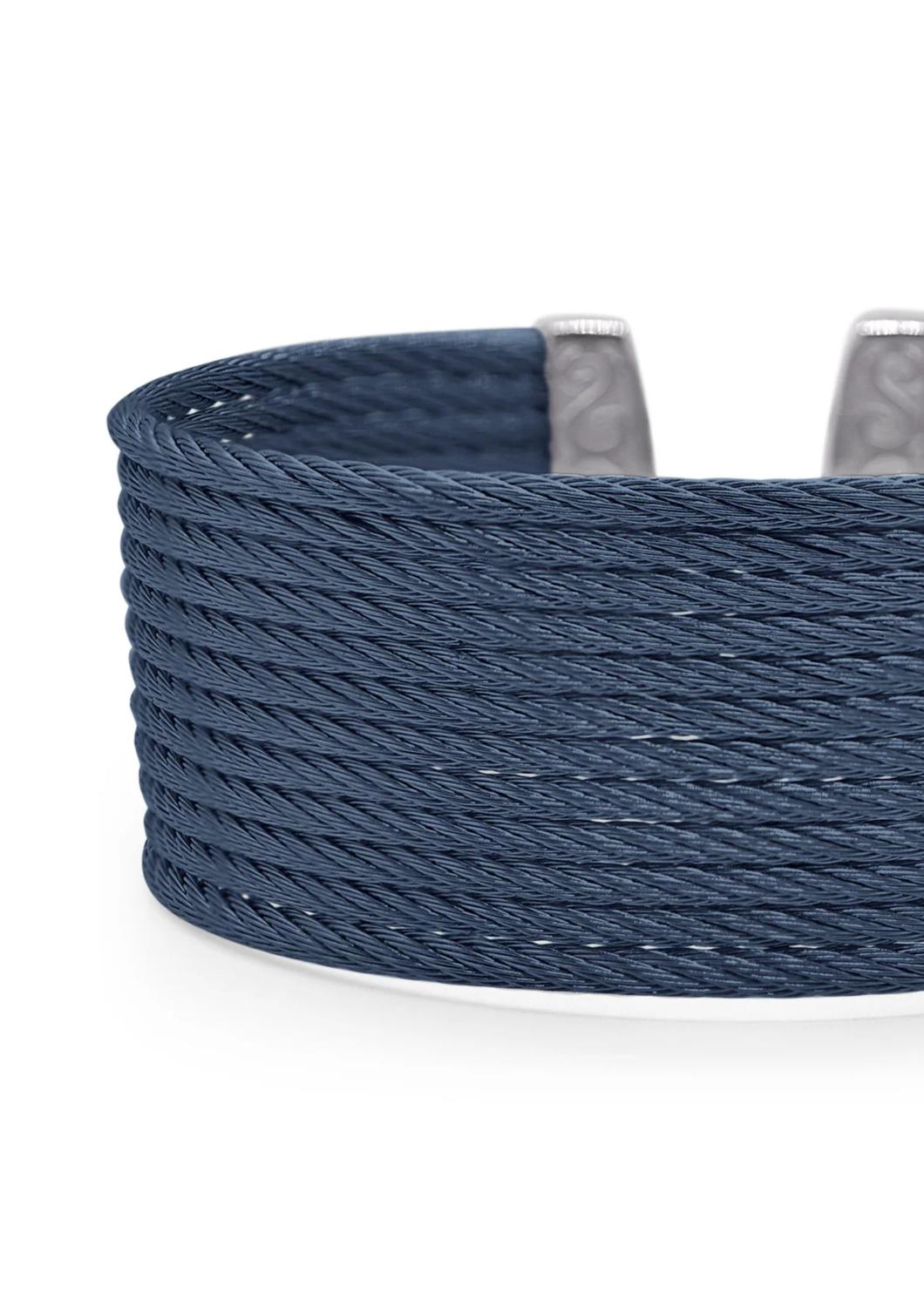 Introducing the Classic Essentials 12-row Cuff by ALOR, a statement piece in a stunning Blueberry hue. This fashion bracelet is crafted with durable stainless steel and features a bold 12-row cable design. The cuff measures 25mm wide, adding substantial flair to any outfit. Imported for quality assurance.
