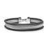 Striking accessory in sophisticated black and grey. Features multi rows of stainless steel cable, expertly stacked for a bold look. Pull back clasp.
