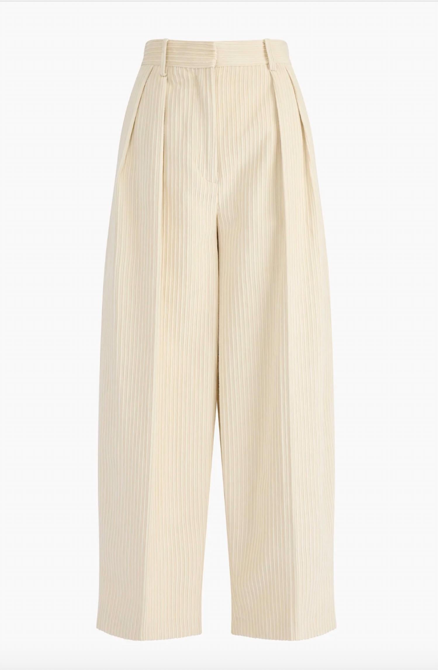 Introducing the Dash Pant by Altuzarra, an embodiment of meticulous tailoring and sophisticated style. Crafted in Italy from a soft cotton-blend comprising 98% cotton and 2% elastane, these ivory trousers feature a cropped, dramatized barrel leg complemented by neat pleats. The textured pattern adds a subtle touch of elegance, while a convenient zip closure ensures a perfect fit. Ideal for a spring holiday party, these pants include pockets for added practicality.