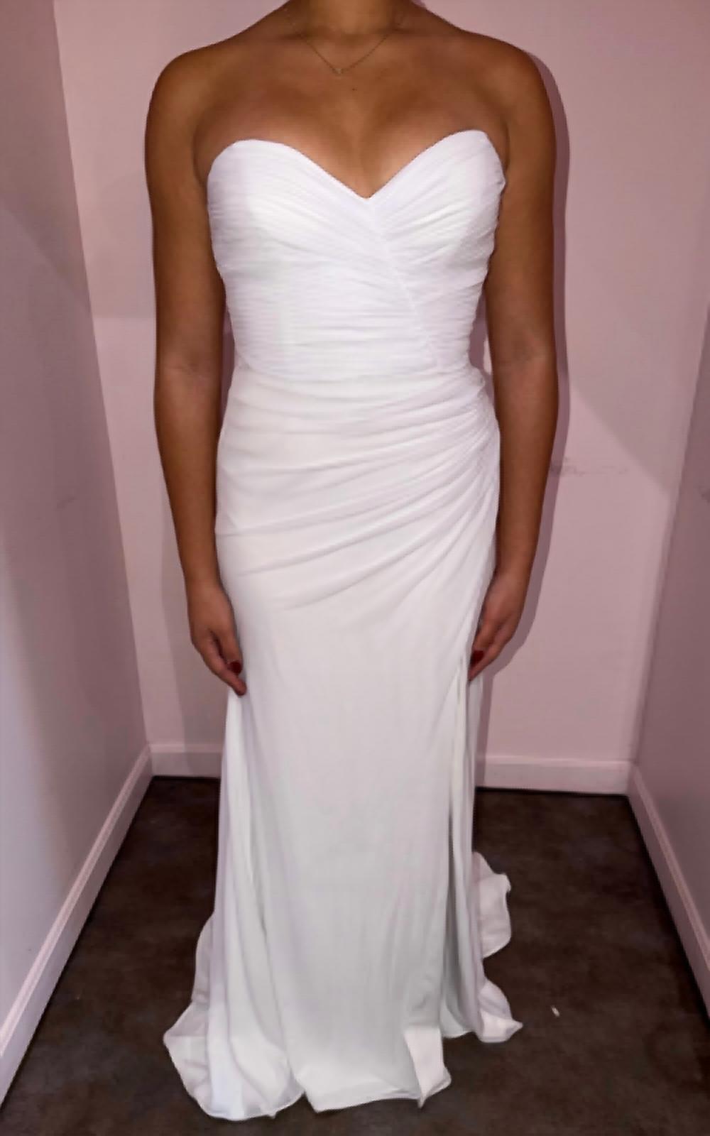 Alyce Paris pure white strapless chiffon sweetheart gown with rouching and side slit. Runs small. Dry clean only.