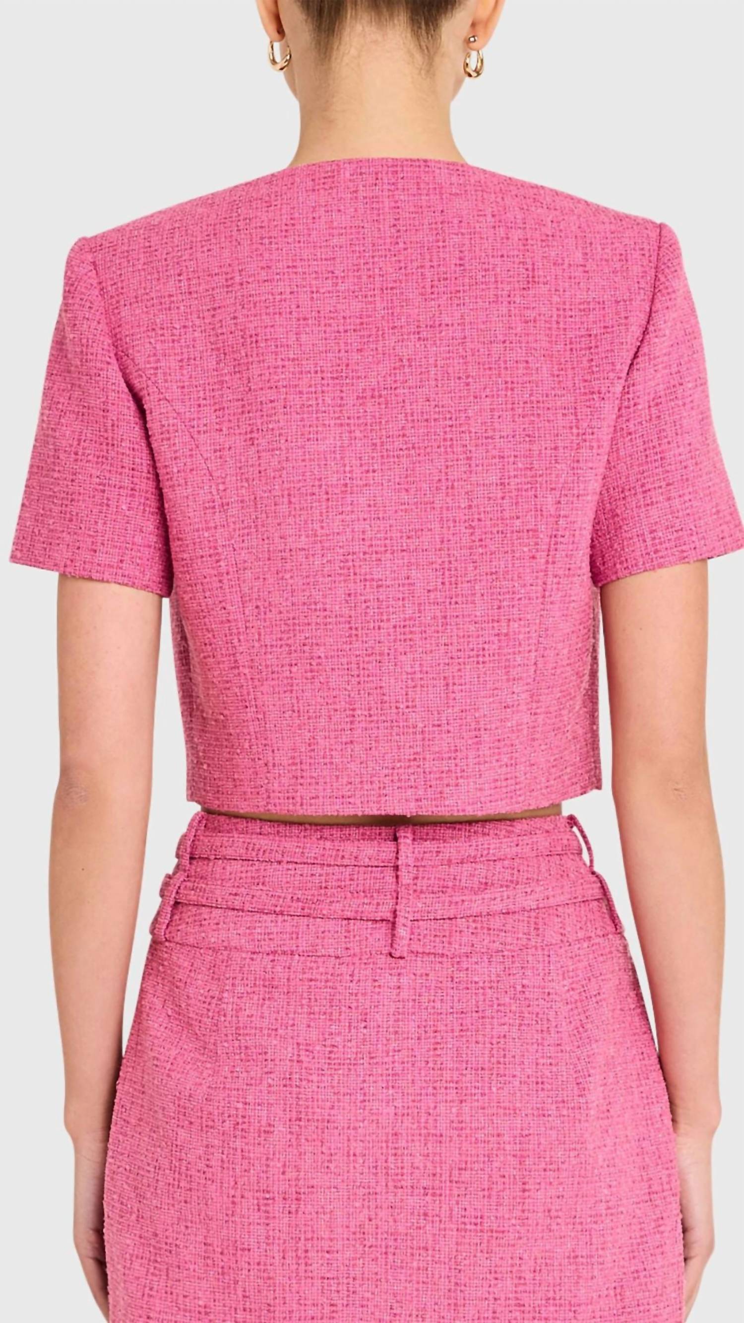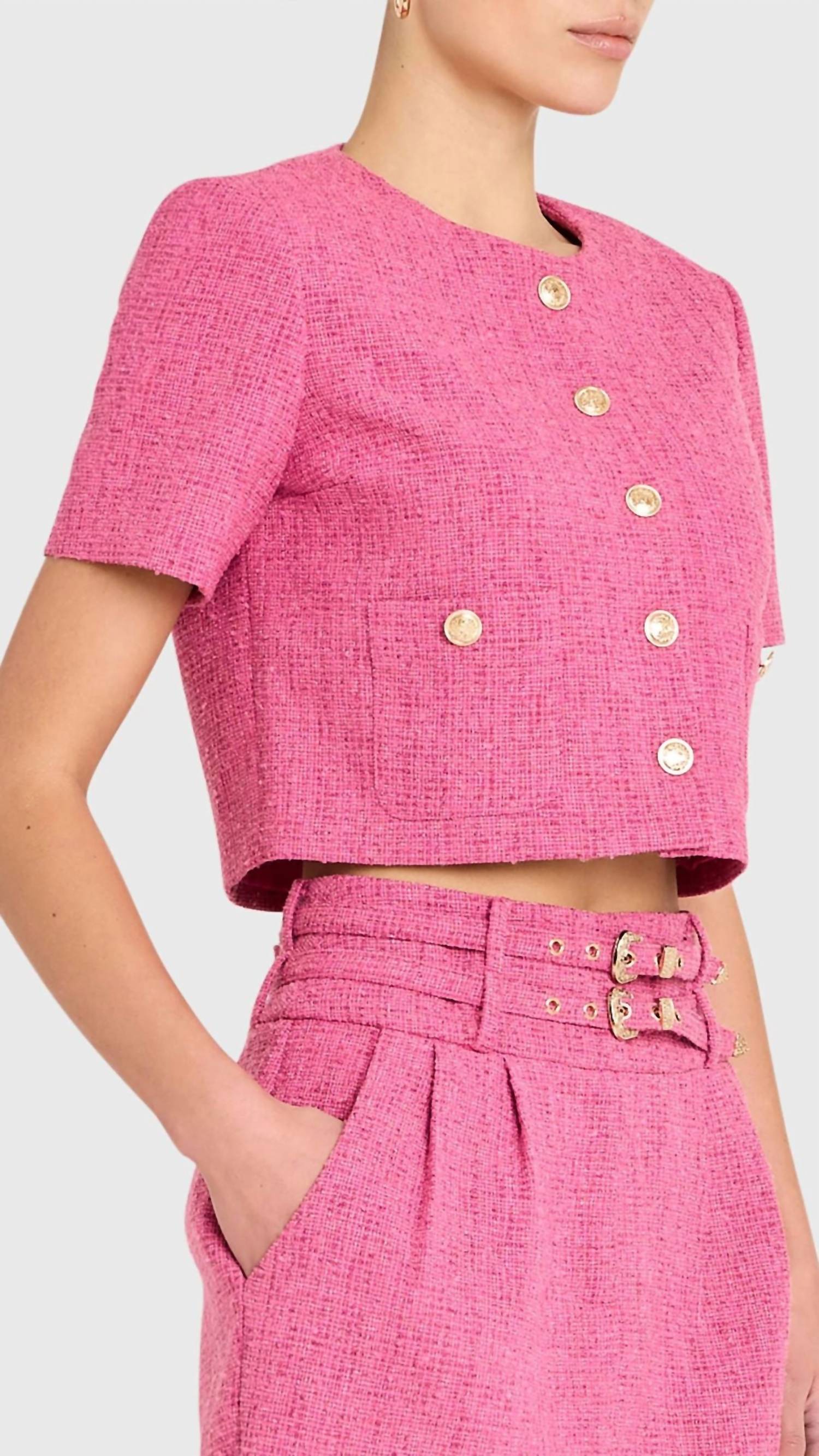 Introducing the Amanda Uprichard Braswell Top in Roseberry, a statement piece that exudes vintage charm. This short-sleeve, crewneck crop top is tailored in textured pink tweed with eye-catching novelty gold buttons and features practical patch pockets at the center front. Composition: Self: 95% Polyester, 5% Viscose; Lining: 100% Polyester. Closure: Button closure. Care: Dry clean only. Model is wearing size XS (5'10.5" height, 31.5" bust, 24.5" waist, 35.5" hips).