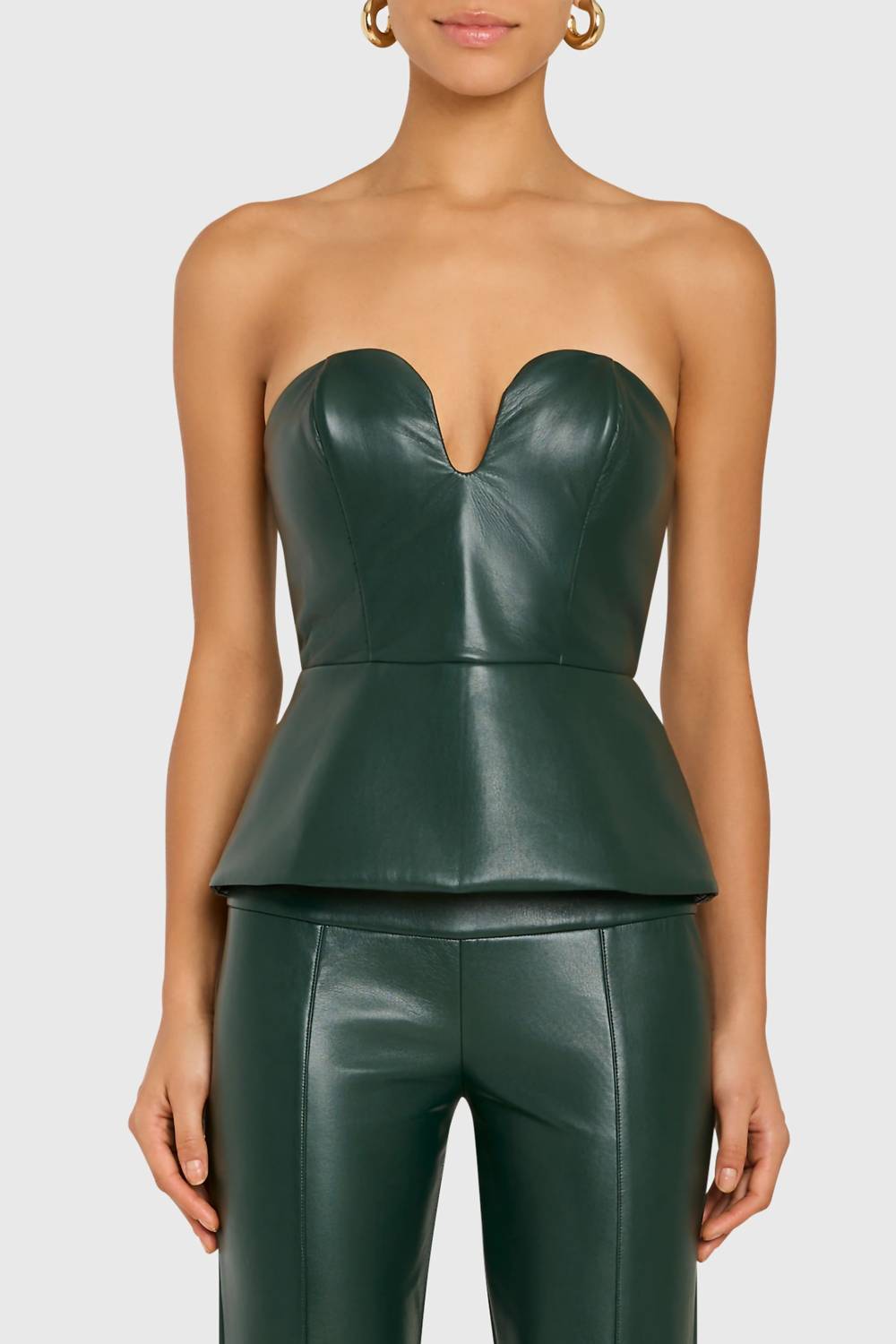 Unveil modern sophistication with the Juno Leather Top by Amanda Uprichard, crafted for chic cocktail parties. This sleeveless, sweetheart neckline piece features a sculpted silhouette with a distinctive peplum hem, ensuring a bold yet feminine aesthetic. Made from a blend of 50% Polyester, 45% Polyurethane, and 5% Spandex faux leather with a 100% Polyester lining, it offers both comfort and flexibility. Closure: Zip closure. Care: Dry clean with any solvent except trichloroethylene.