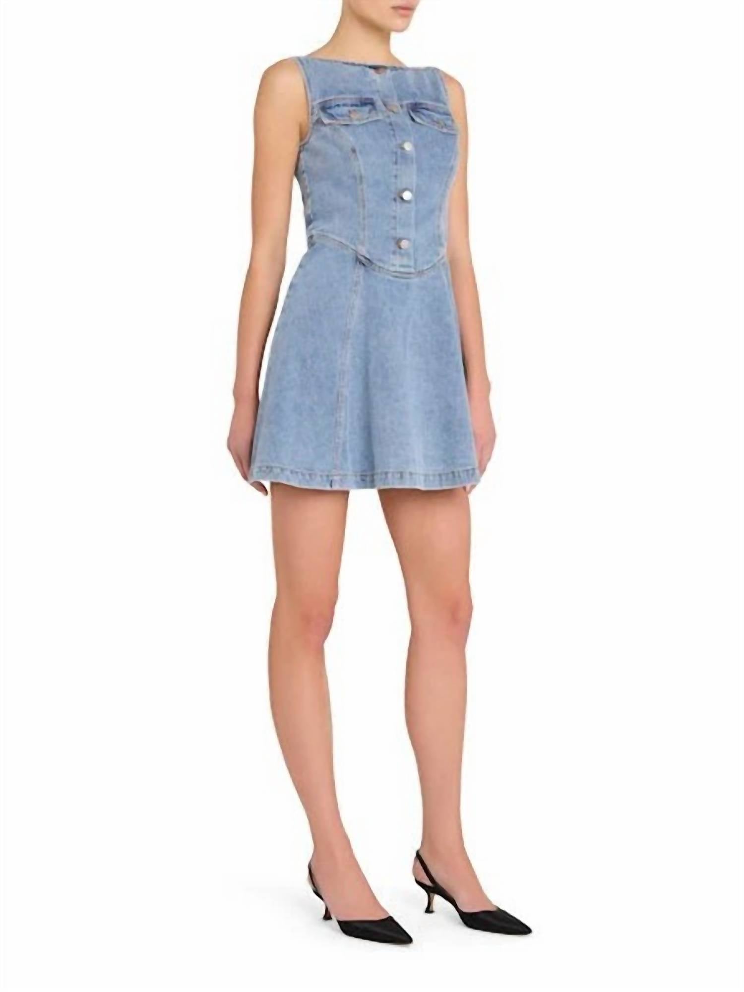 The Scorpio Dress by Amanda Uprichard in Destiny Wash combines sophistication with comfort for any occasion. This sleeveless mini dress is crafted in denim and features a classic boatneck and a unique button closure with a convenient center back zipper for the perfect fit. Its solid, minimalist design offers a modern twist while retaining a classic mod aesthetic, making it an ideal choice for both casual outings and dinner parties.