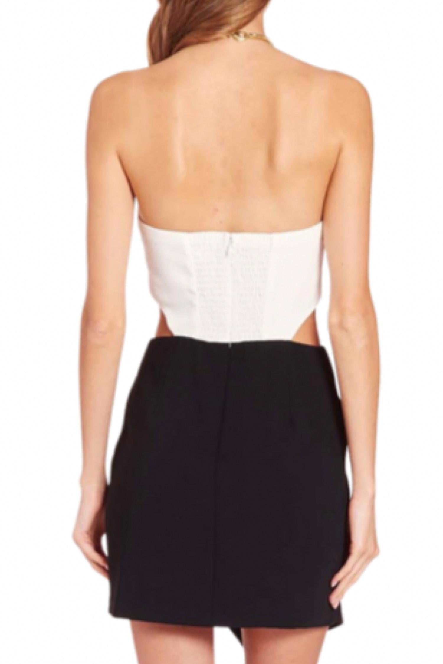 The kind of easy and flattering dress you'll be reaching for all season long. Elevate your style with the Tyler Halter Cutouts Mini Dress by Amanda Uprichard, a stunning piece in ivory and black. This sleeveless wonder boasts a halter neckline with chic chain detailing, complemented by side waist cutouts for an alluring touch. Crafted from 100% Polyester, the dress features a smocked top back and a secure fit with an invisible center back zipper and hook & eye closure. Care: Dry clean only for long-lasting elegance.