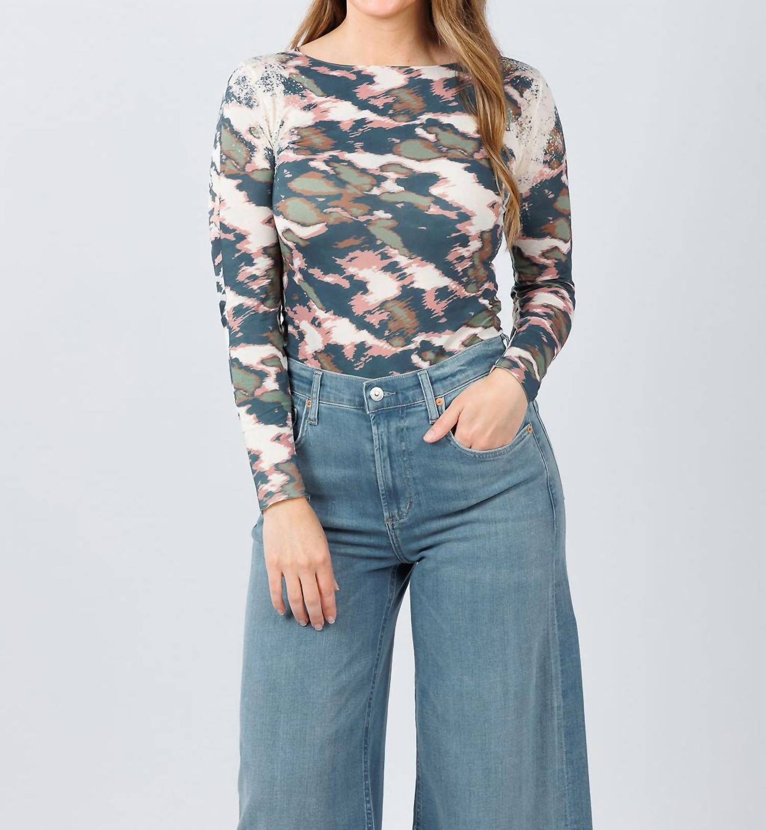 Embrace both comfort and style with the AMB Designs Camouflage Art Raw Edge Second Skin Top in Angora. This long sleeve tee is crafted from 92% Nylon, 8% Spandex, featuring a semi-sheer finish, designed to flatter with its higher crew neckline and raw cut edges. The standout Original Camo Art print adds a bold, artistic flair to any spring occasion. Made for easy wear, it features a pull-on closure and is machine washable, fitting sizes 0-12.