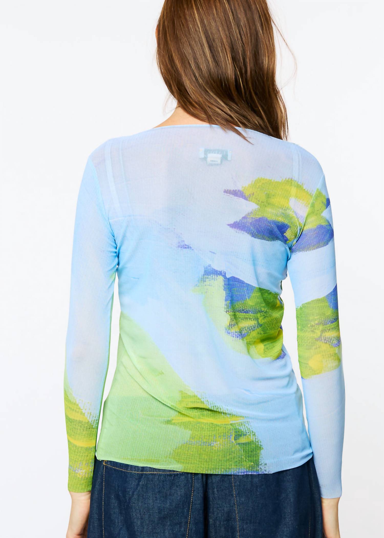 The AMB Designs NudiTee Sheer Top in Easy Breezy effortlessly combines style and comfort. Featuring long sleeves crafted from a silky soft mesh fabric, this graphic piece showcases the whimsical Easy Breezy print in sky blue and lime. Made in the USA, the top is composed of 90% nylon and 10% spandex, offering a breathable fit that feels like a second skin. Designed with a crewneck and a convenient pull-on closure, this one-size-fits-all garment is perfect for adding a touch of fun to your spring wardrobe. Care instructions: Hand wash only.