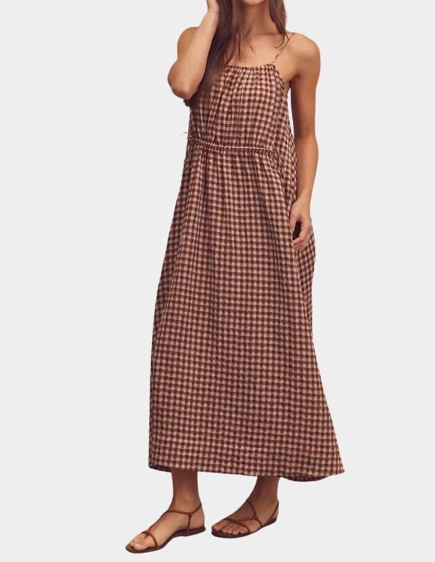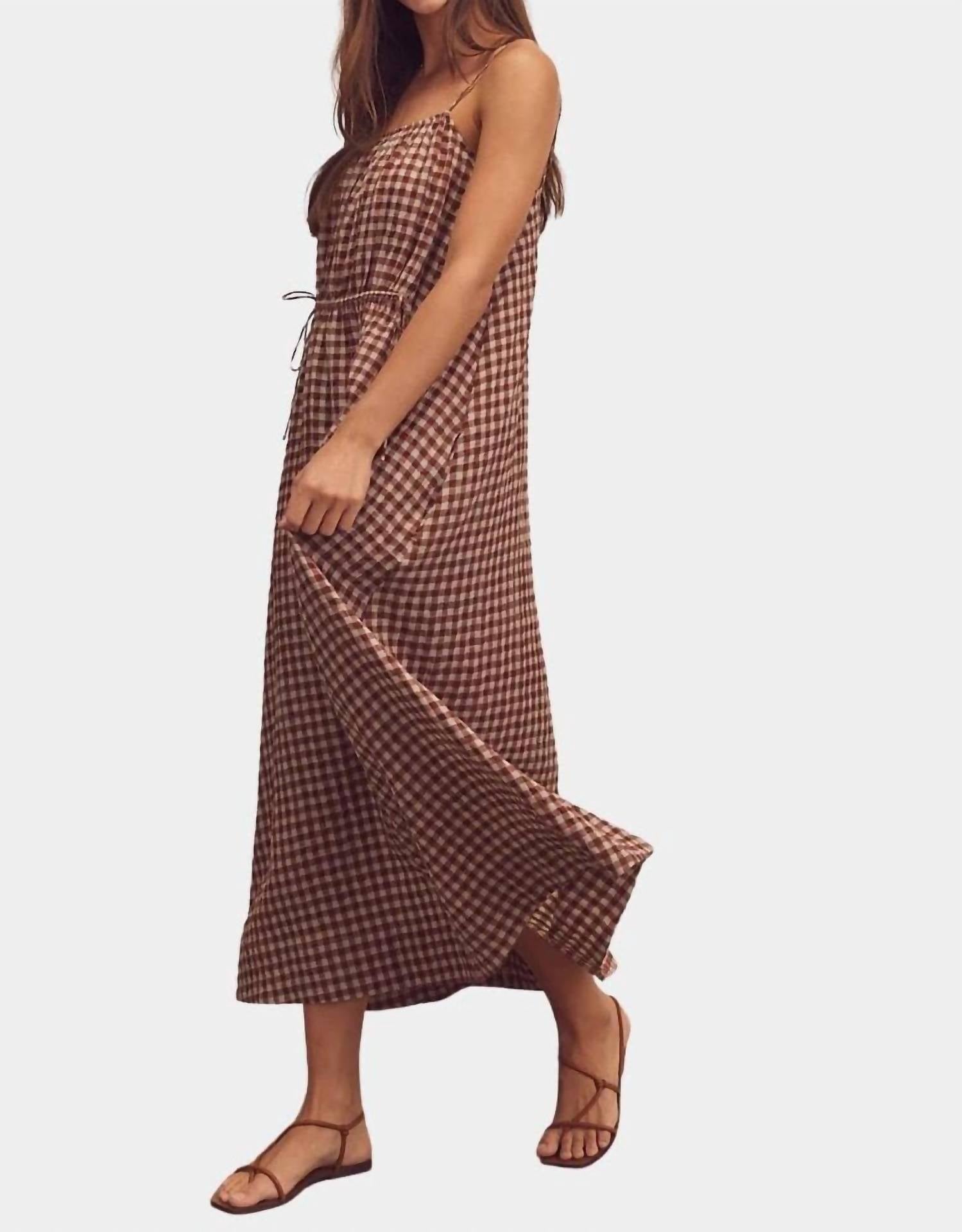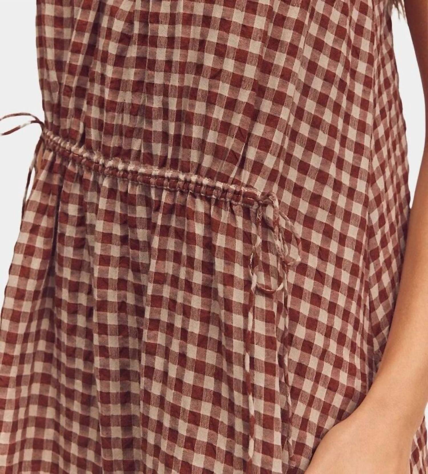 The Front Shirring Gingham Cami Midi Dress in Brick by Amente exudes Boho Chic elegance perfect for summer occasions. This sleeveless dress is crafted from a 75% linen and 25% cotton blend, offering a breathable and soft feel. Designed and made in Los Angeles, it features a scoopneck and a shift silhouette, effortlessly complementing its relaxed, ankle-length style. With a pull-on closure and delicate front shirring for texture, care is simple with hand wash and dry flat instructions. Model is 5'9" and wears XS/S, showcasing the timeless versatility of this piece.