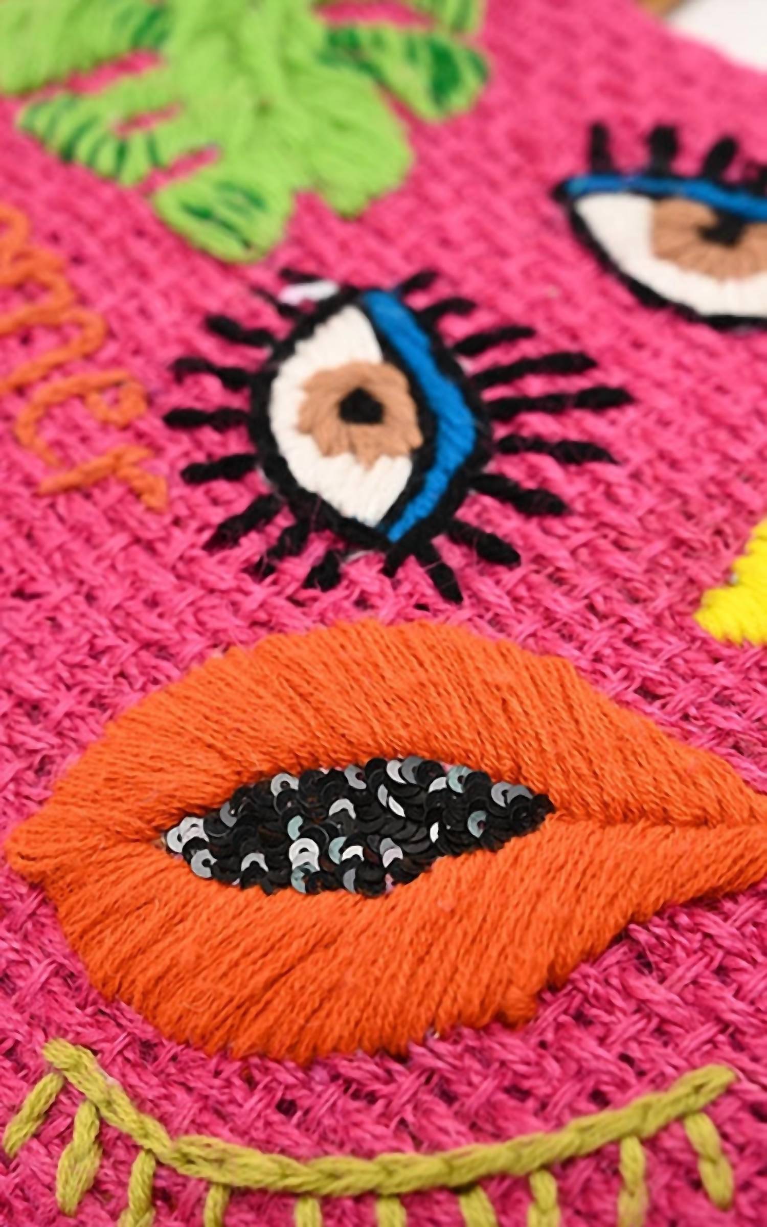 Aside from being the cutest bag ever, this tote is the perfect size to hold all of your vacation necessities. Pair this adorable bag with a flowing dress and some slides and you're all set! Experience the elegance of the Fruitful Charm Top Handle Tote Bag by AMERICA & BEYOND, crafted from 100% jute in a delightful Pink Bliss hue. This chic tote includes durable bamboo-looking handles and a magnetic button closure for secure storage. Adorned with front bead embellishments and crafted from cotton jacquard with a touch of gold lurex, it features a detachable, adjustable strap with lace detailing for versatile wear. The lined interiors offer a zip pocket and a mobile pocket, with a sizable 11.5" x 9.5" x 3.5" dimension perfect for daily essentials.