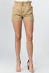 These shorts feature a paperbag detailed waist, front button closure, and a rolled-up hem. The inseam is 3.25". Made from 97% cotton and 3% spandex.