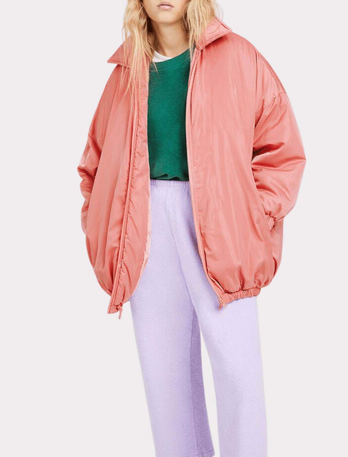 Experimente conforto e estilo com a Jaqueta American Vintage Yabay em um charmoso tom rosa. Com forro leve, esta jaqueta possui fecho de zíper, design simples e gola xale para um toque elegante. Seu caimento relaxado é complementado por cós elástico, costuras tom sobre tom, textura de tecido suave e bainha com cordão para ajuste.