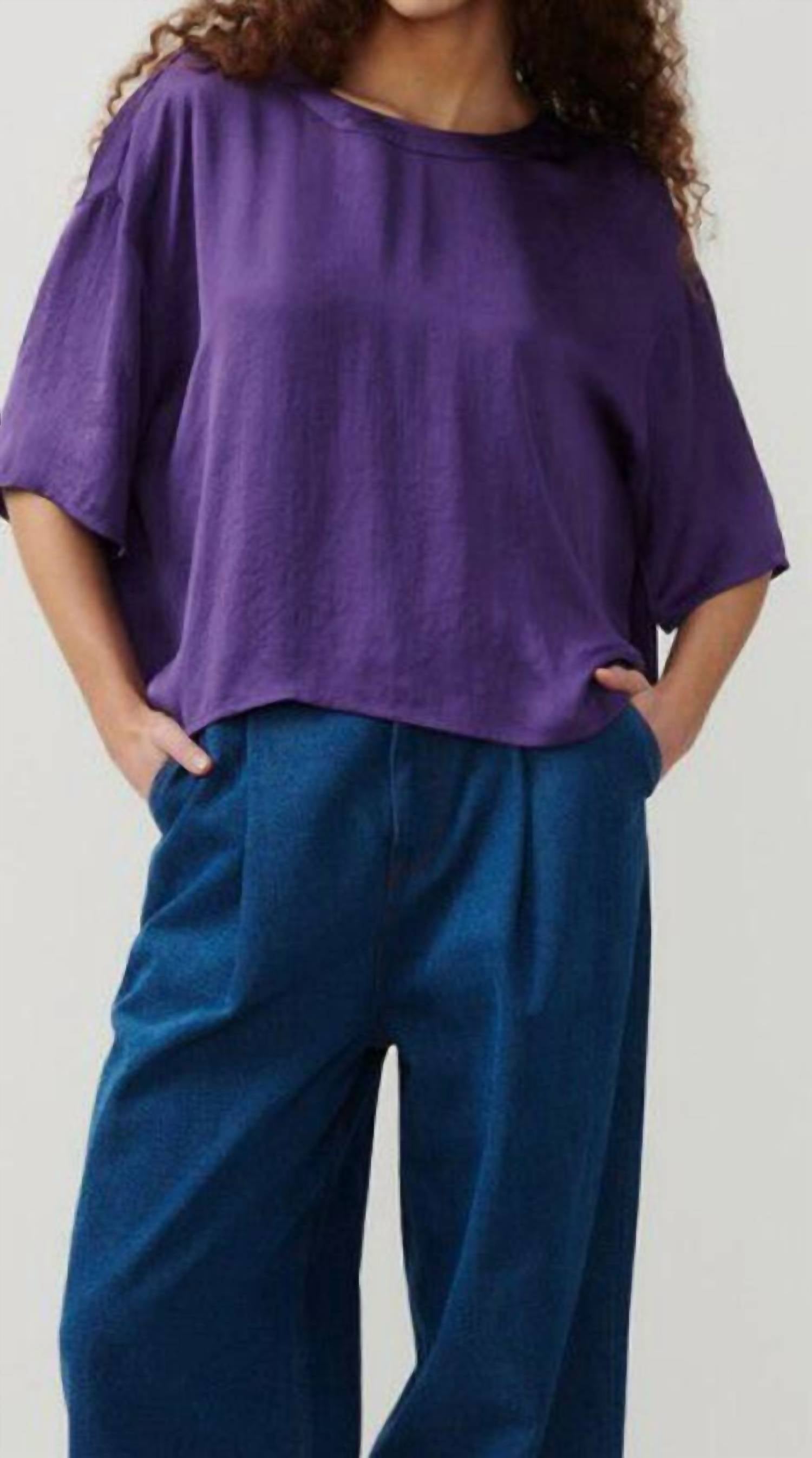 Pair this with your favorite jeans and slides for your next girls night out. Unveil a burst of vibrant style with the Widland Top by American Vintage, perfect for any holiday party. This minimalist blouse in striking neon purple features a classic crewneck and short sleeves. Made from 100% acetate, it boasts a sophisticated tie closure for an adjustable fit. Embrace effortless chic this spring with a solid-patterned piece made for women's fashion.