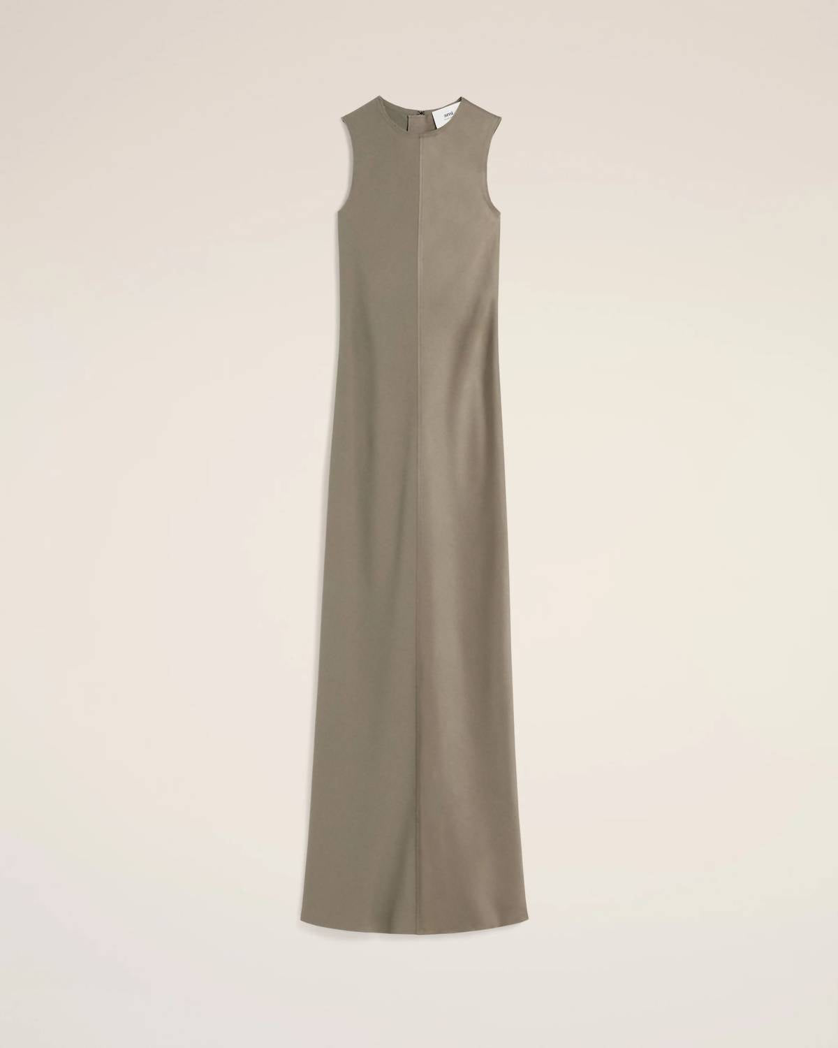 Style this maxi with your favorite statement necklace and sandals for the perfect look. Introducing the AMI Long Straight Dress in sophisticated Ash, perfect for your summer vacation wardrobe. This sleeveless maxi dress offers a straight fit, measuring 145 cm in length for size 36, and is crafted from 71% Acetate and 29% Viscose, featuring a unique combination of matte and shiny finishes. Made in Madagascar, it is designed with an invisible back zip closure and an eye-catching Ami de Coeur mini plate at the hem. For optimal care, please dry clean using a petroleum solvent on a gentle process and avoid washing or tumble drying.