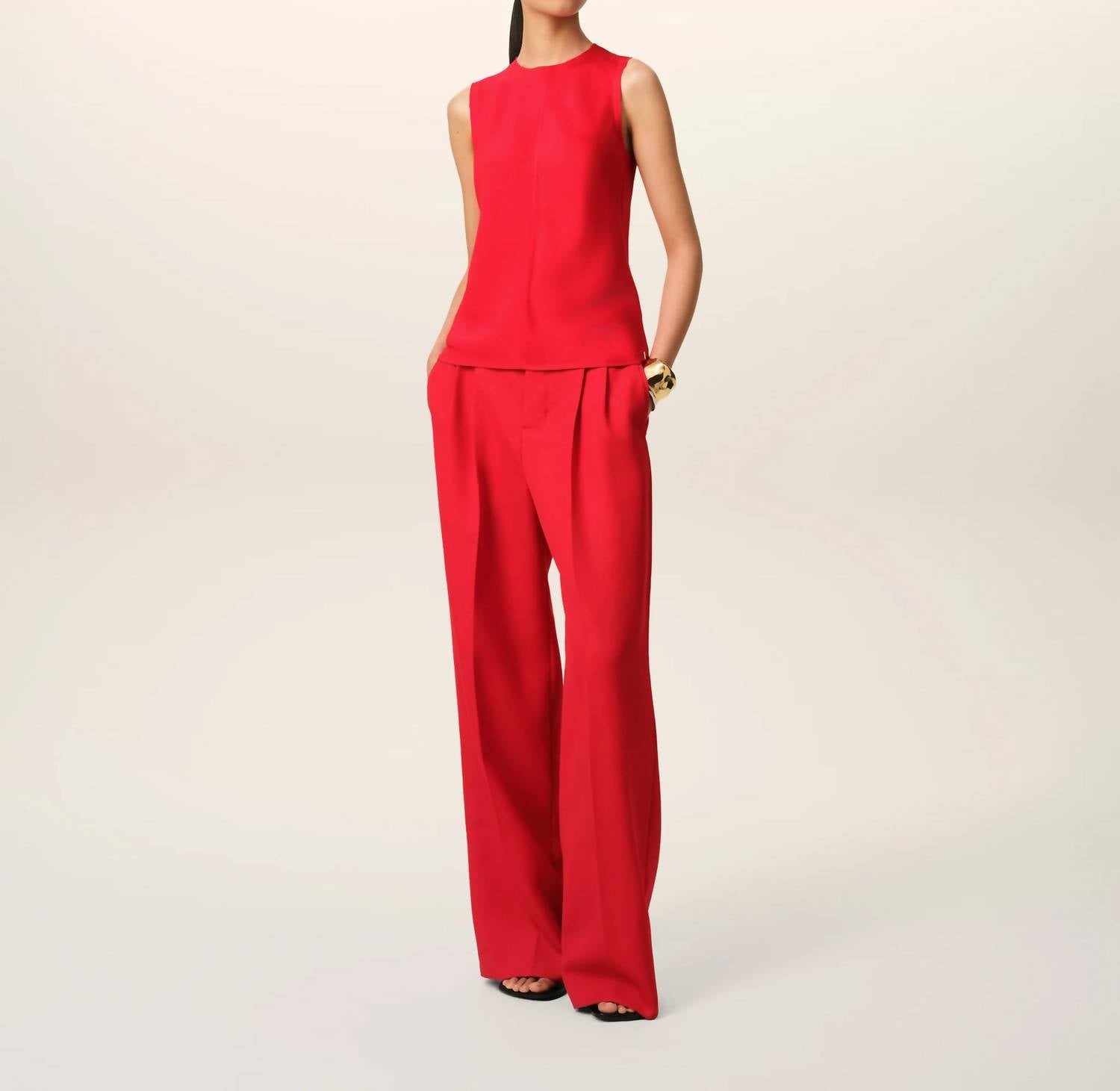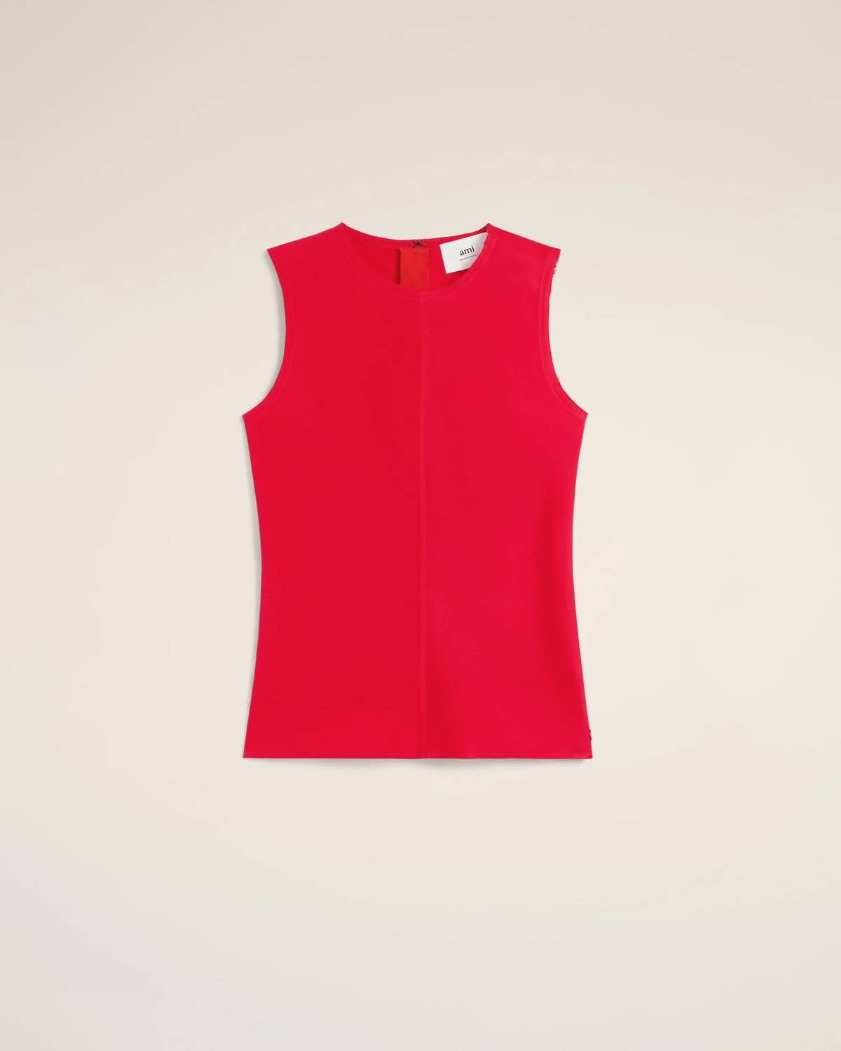 Discover the AMI Sleeveless Tank Top in vibrant Poppy Red, perfect for your summer wardrobe. This crewneck tank features a chic rounded neckline and an invisible zip closure at the back, crafted from a blend of 71% Acetate and 29% Viscose for a subtle contrast between matte and shiny textures. Made in Madagascar, this top has a center back length of 56 cm for size 36, designed to complement a straight fit or offer a semi-fitted cut in a larger size. Care is simple with a dry clean using petroleum solvent, and a cool iron for touch-ups.