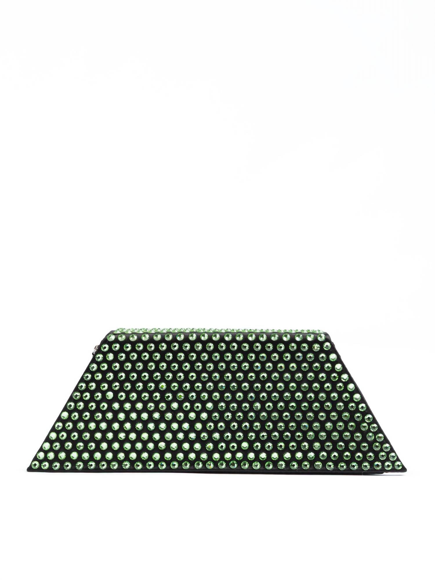 This crossbody bag will be your go-to bag of the season. Discover the Mini Crystals Shoulder Bag by AMINA MUADDI, an exquisite piece combining style and sophistication. Made in Italy, this crossbody bag features a blend of 50% silk and 50% crystals externally, with a 100% silk interior and 100% brass chain hardware. It includes an internal pocket and a practical magnetic closure, with a detachable crossbody chain for versatility. Dimensions are 3.54 inches in height, 9.44 inches in length, and 2.36 inches in depth, offered in a chic green hue.