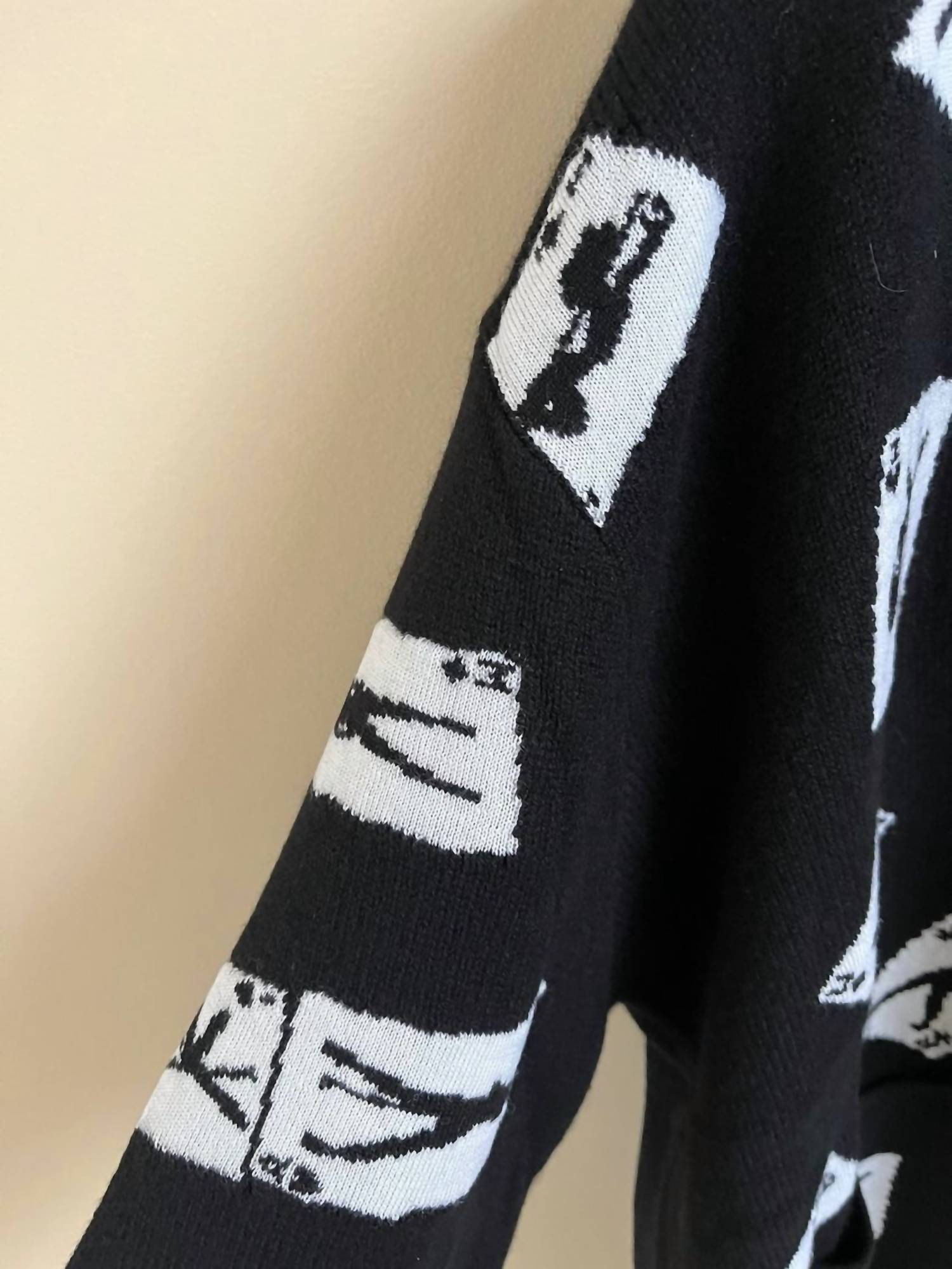 Elevate your fall wardrobe with the Cards Intarsia Cardigan Sweater by Amiri, crafted from a luxurious cashmere blend for ultimate softness. This black cardigan features long sleeves and an intarsia-knit pattern depicting playing cards and dancers, adding a vintage touch to your holiday party attire. Designed with a sophisticated V-neckline, the cardigan offers a classic button closure ideal for festive gatherings. Care: Machine wash.