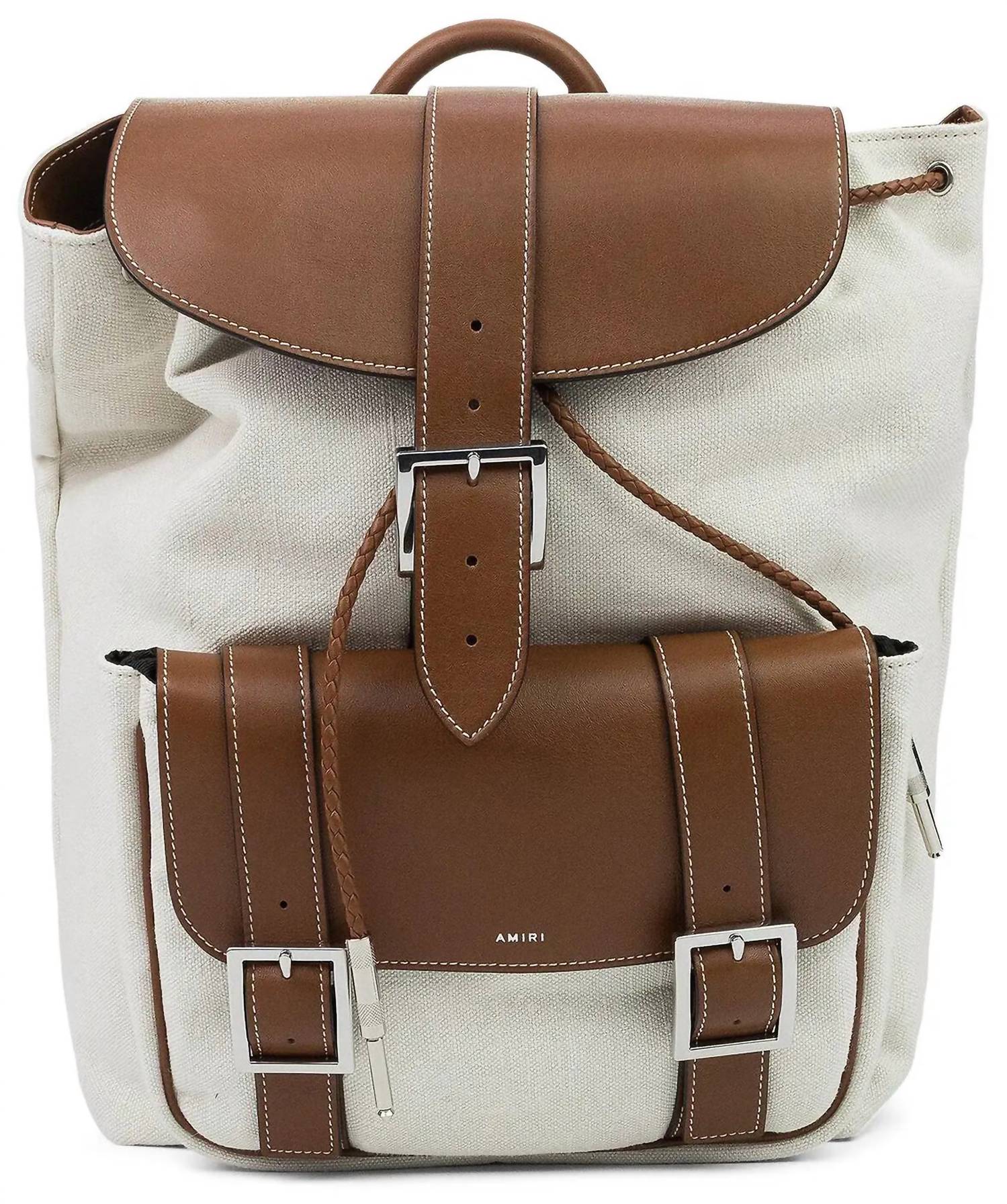 Discover the Amiri Men's Canvas Rucksack Backpack, an elegant blend of cream canvas with brown leather trim. Designed for both style and functionality, it boasts dimensions of 13.25 inches in height, 11.4 inches in width, and a depth of 5 inches, making it a perfect companion for daily use. Crafted with meticulous attention to detail, this backpack seamlessly combines a classic look with modern utility. Whether you're heading to the office or a weekend getaway, this versatile piece is sure to enhance your ensemble.