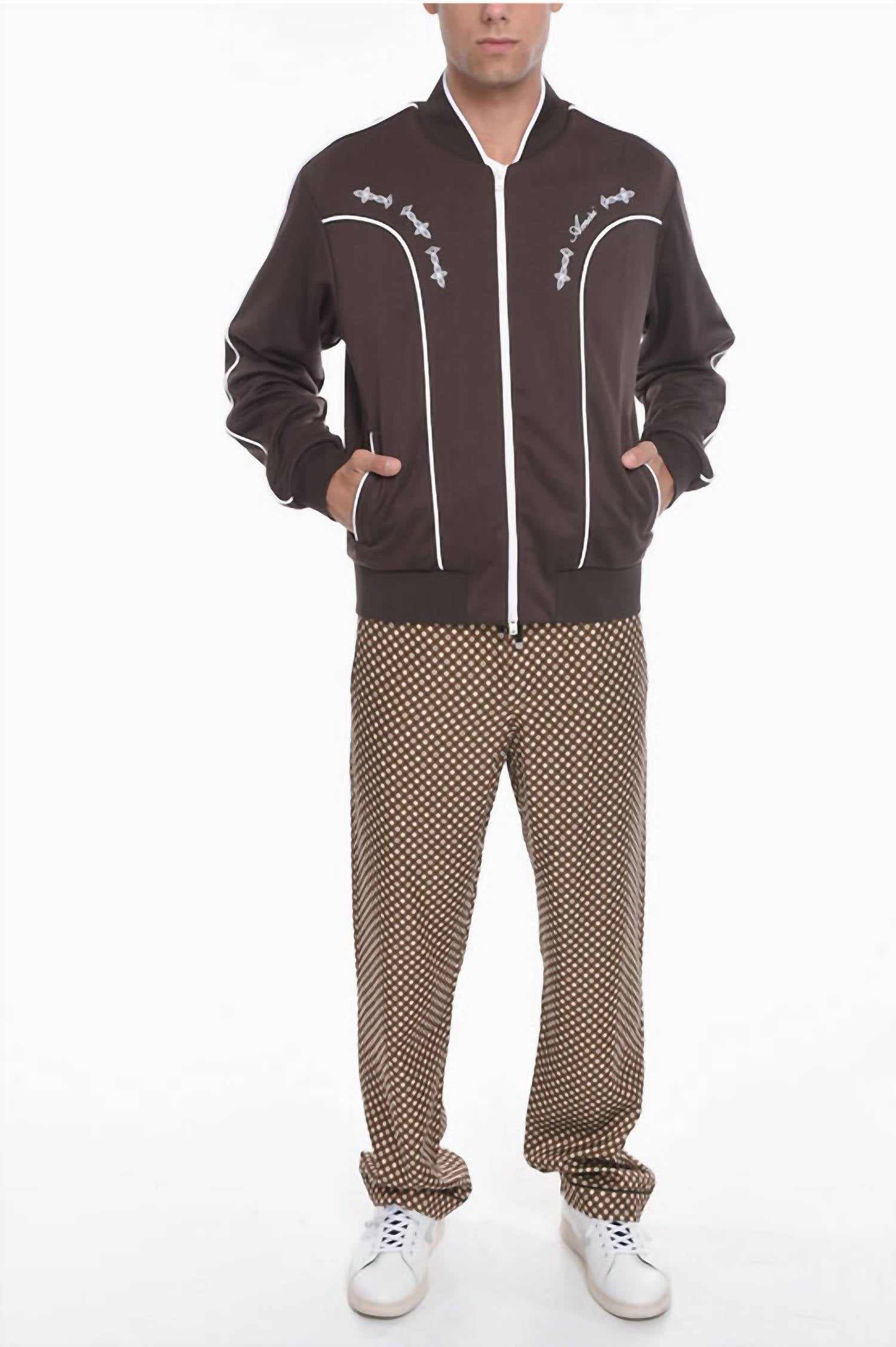 Introducing the Sheen Track Jacket by Amiri, a perfect blend of style and sophistication for the modern man. This brown bomber features long sleeves, a convenient zip closure, and two functional pockets, all crafted in Italy from high-quality polyester to bring you warmth and style. Embrace the holiday party trend with its minimalist embroidered pattern, perfectly suited for Thanksgiving gatherings. For optimal care, it is recommended to dry clean this versatile and elegant piece.